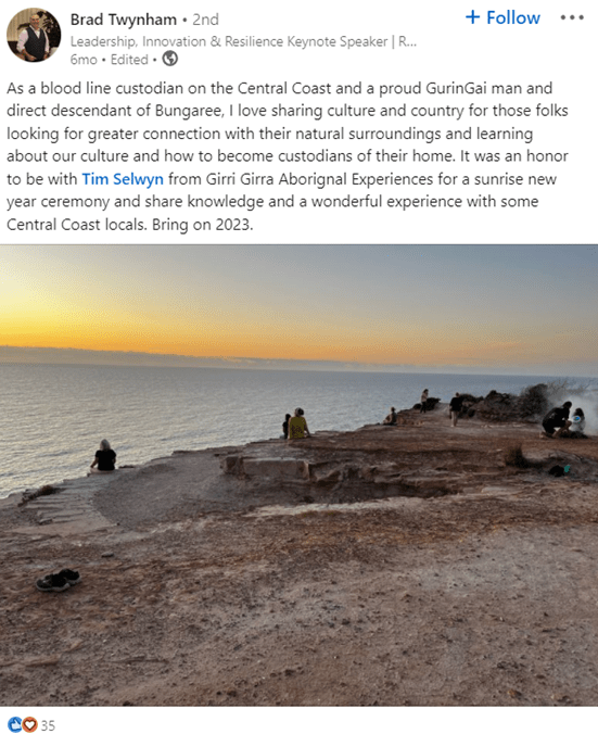 “I believe we need to heal now as a nation, become proud that on our shores we hold the oldest living culture on earth and all become custodians of that culture and the country in which we live.” Bradley Twynham – GuriNgai devotee.