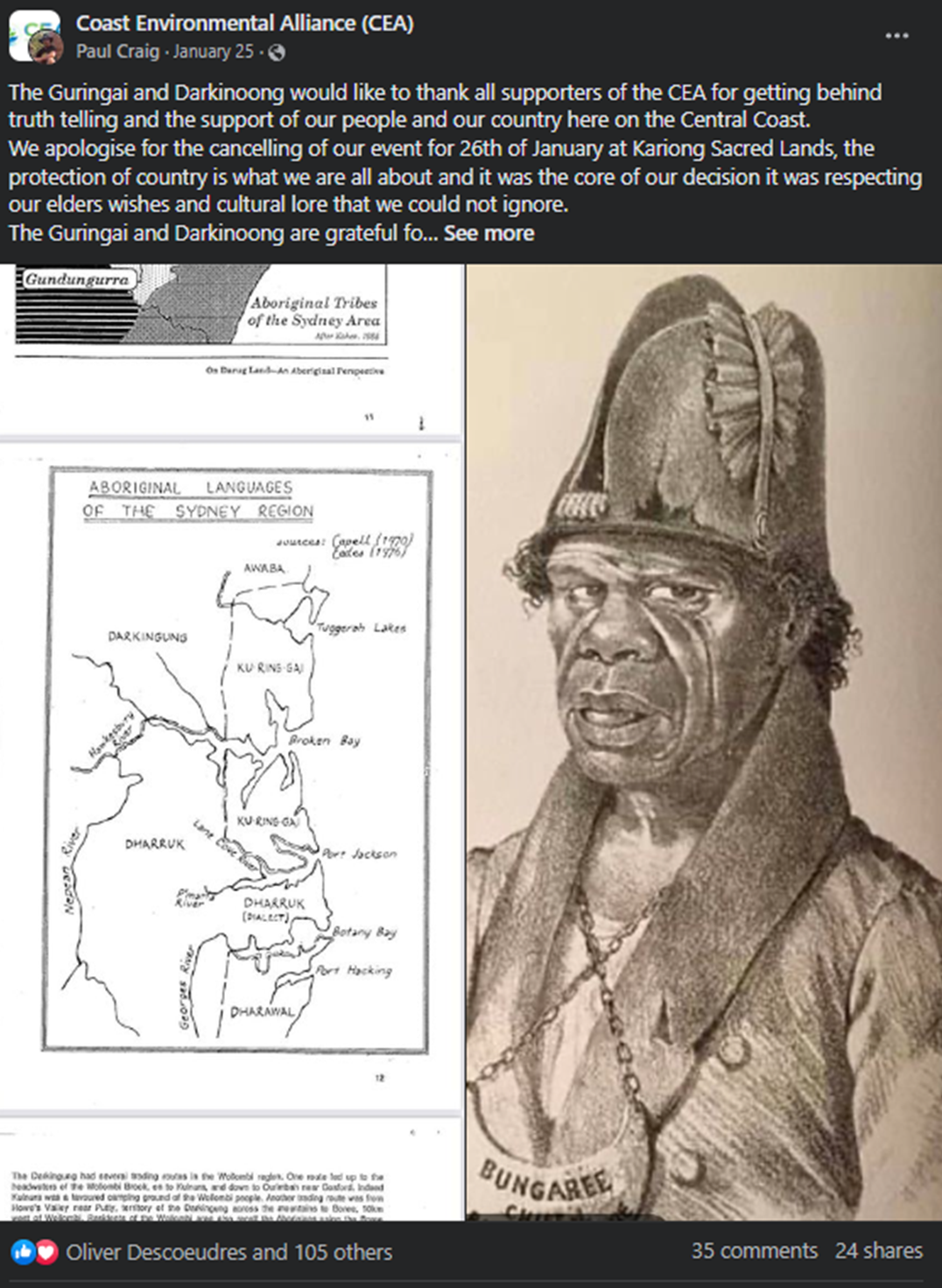 Followers of the many ‘colorful characters’ in the area with blatantly self-serving agendas, and groups such as Coast Environmental Alliance (CEA) have rallied to Guringai Tribal Link membership, and uncritically accept every unproven and disproven claim they regurgitate, because it ‘feels’ right to them in the moment.