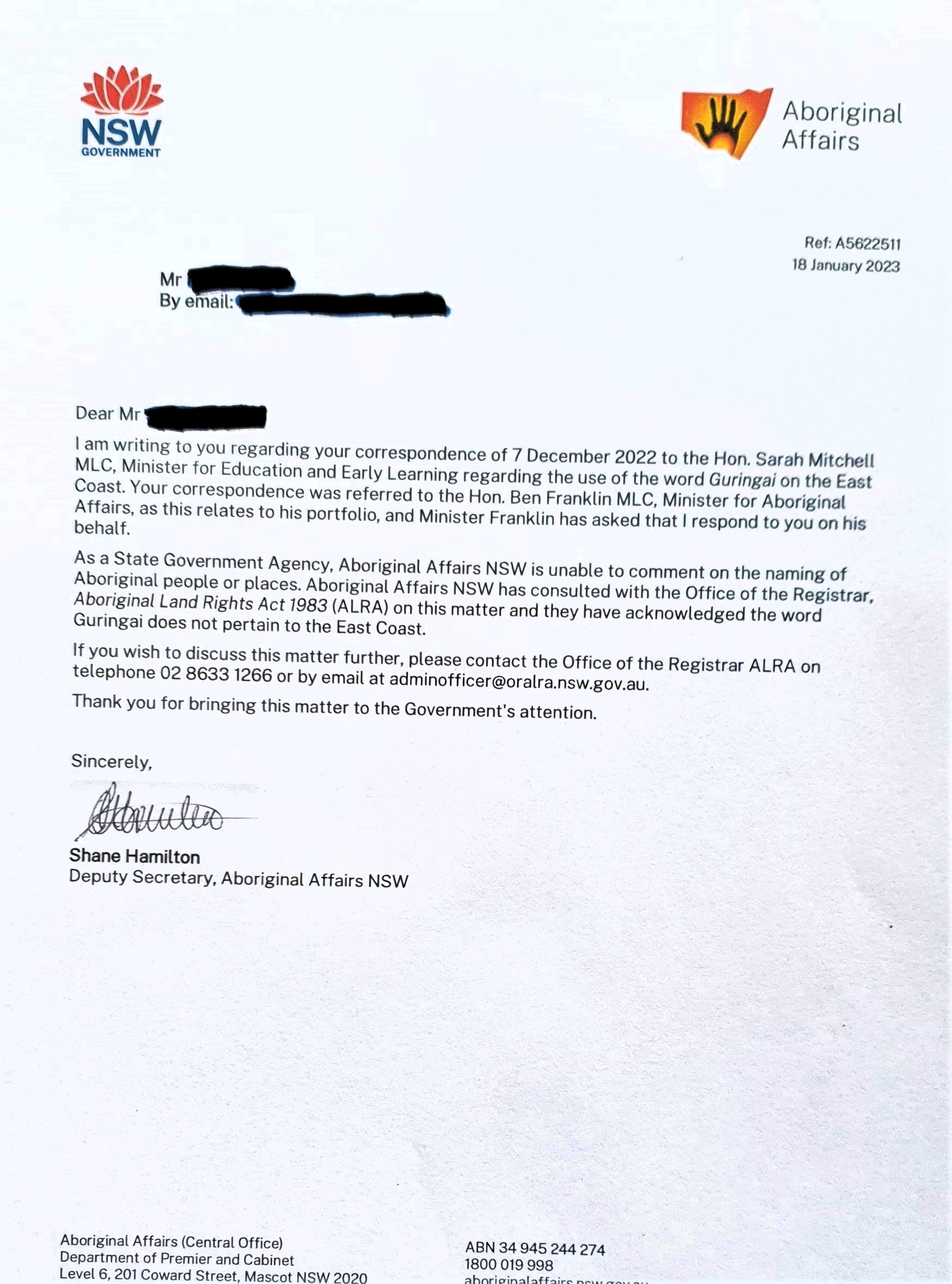 The NSW Department of Aboriginal Affairs, confirms that the Office of the Registrar of the Aboriginal Land Right Act 1983 (ALRA) have acknowledged that the word Guringai does not pertain to the East Coast. This means not in the Northern Beaches of Sydney, and certainly not in the Central Coast.