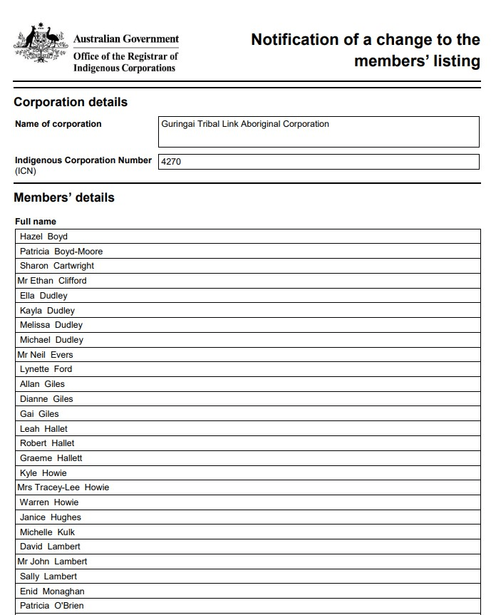 Publication of an Updated Membership of Guringai Tribal Link Aboriginal Corporation. Not only is Dennis Foley finally off the books, but now Laurie Bimson and Tony Bimson are nowhere to be seen! With Laurie Bimson having been a member and Director of Guringai Tribal Link for many years up to this point; it’s disappointing that these people can’t be relied on to give a credible explanation for what is going on.