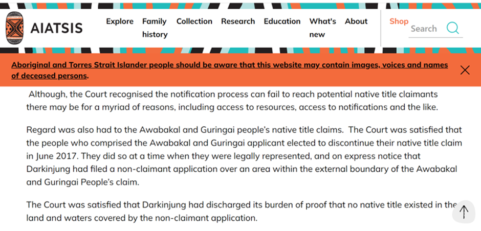 The Court was satisfied that the people who comprised the Awabakal and Guringai applicant elected to discontinue their native title claim in June 2017. They did so at a time when they were legally represented, and on express notice that Darkinjung had filed a non-claimant application over an area within the external boundary of the Awabakal and Guringai People’s claim.