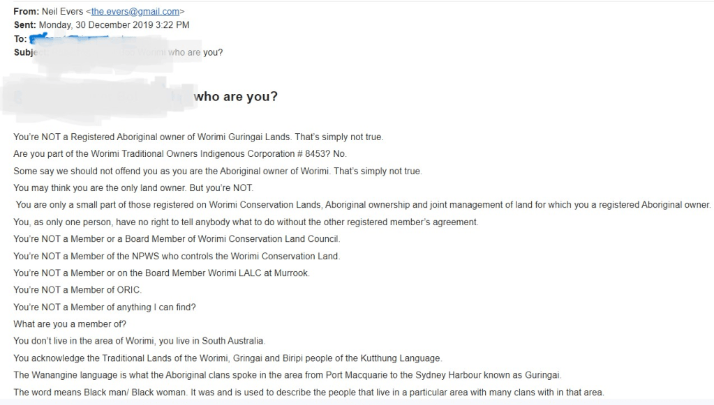 Another leaked email, this time from former Guringai Tribal Link Director Dennis Foley. Dennis spills the beans, stating “the Bimson’s of the world found out about 10 years ago when rummaging through a deceased aunts belongings papers and pictures that somehow miraculously made them all experts and Aboriginal elders.