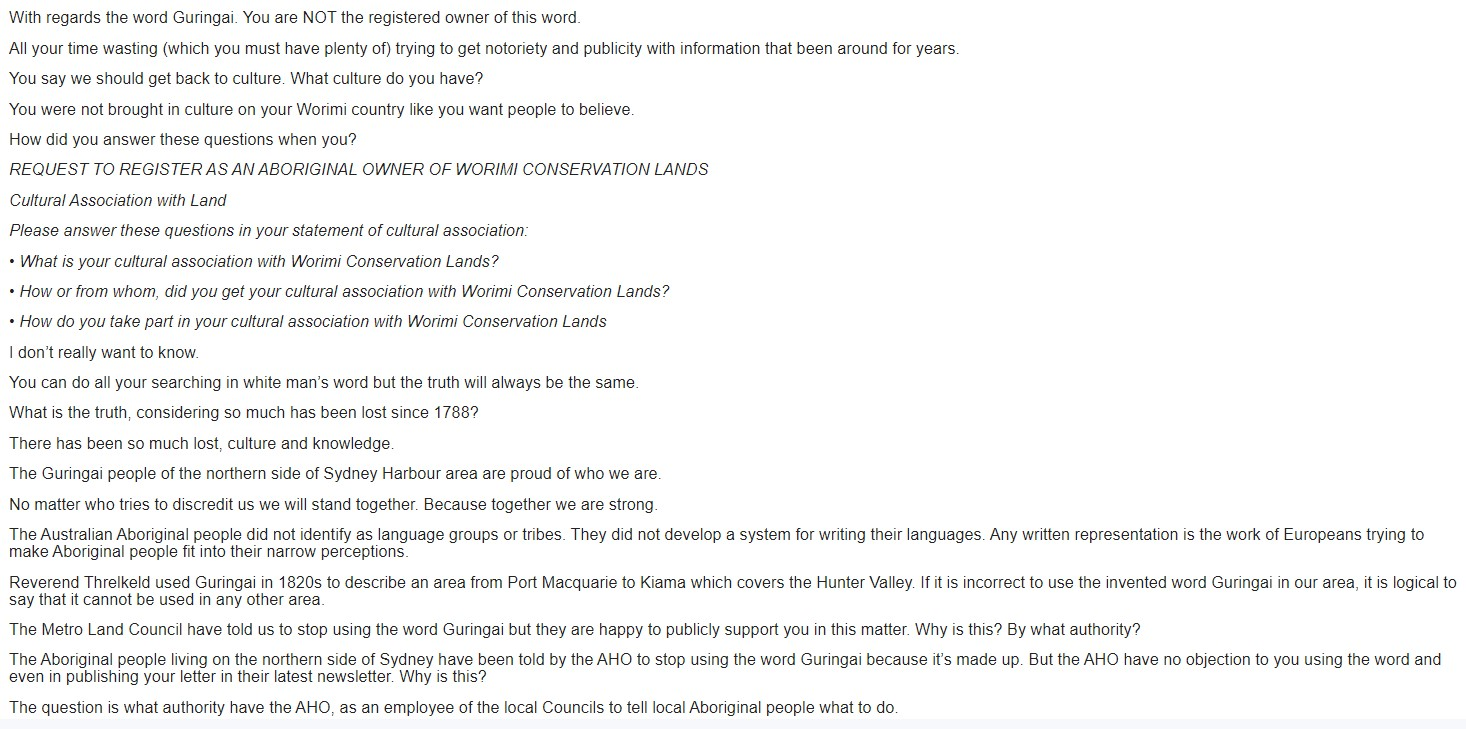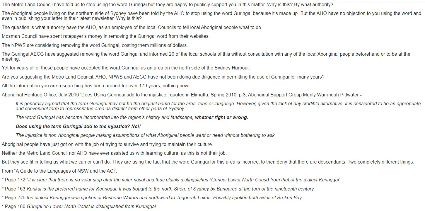 Leaked Email from the director of Guringai Tribal Link Aboriginal Corporation, and the owner and operator of Guringai Tours, and Guingai Tours Pty Ltd: Laurie Bimson.