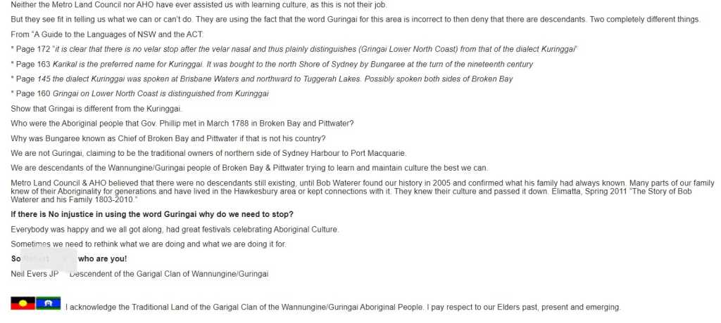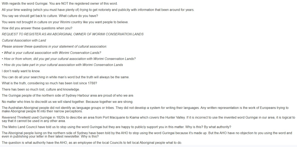 a number of individuals who identify as Guringai and claim to be traditional owners of Northern Sydney. “This is a fallacy,” Mr Moran said, “and totally disrespects the required process to qualify for traditional ownership under the respective NSW Aboriginal Land Rights Act and Commonwealth Native Title Act.”