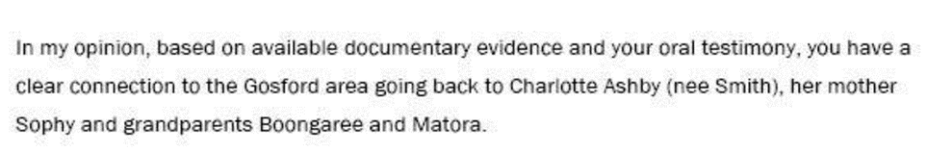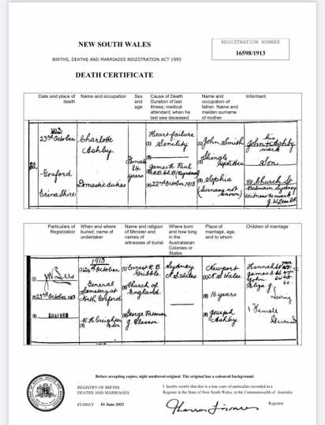 Charlotte Webb/Ashby’s Death Certificate lists her mother as ‘Sophia’, surname not known. No connection to Bungaree, Matora, or any known member of our mob.