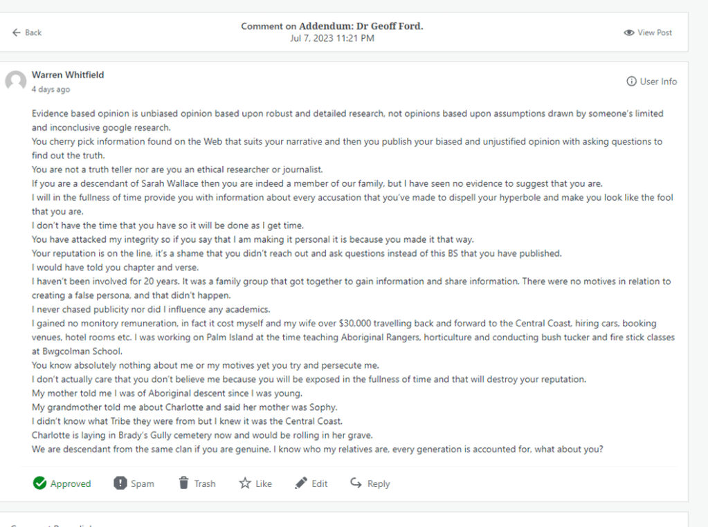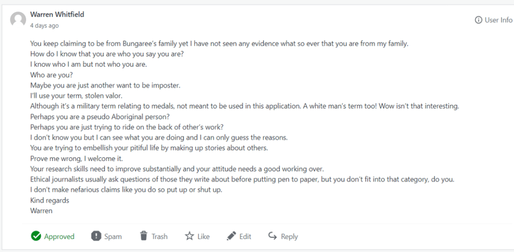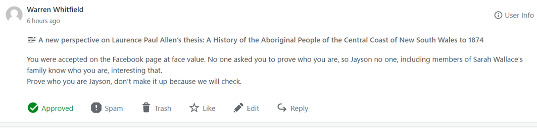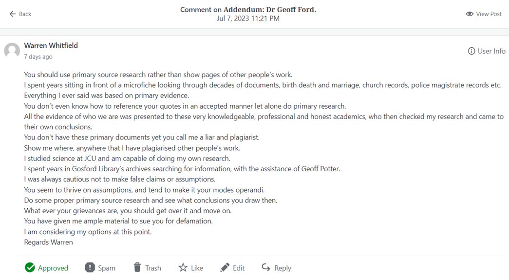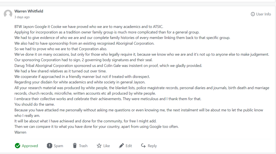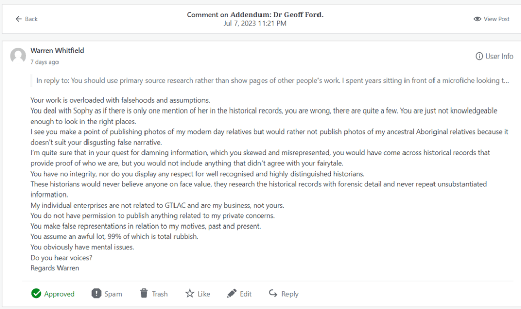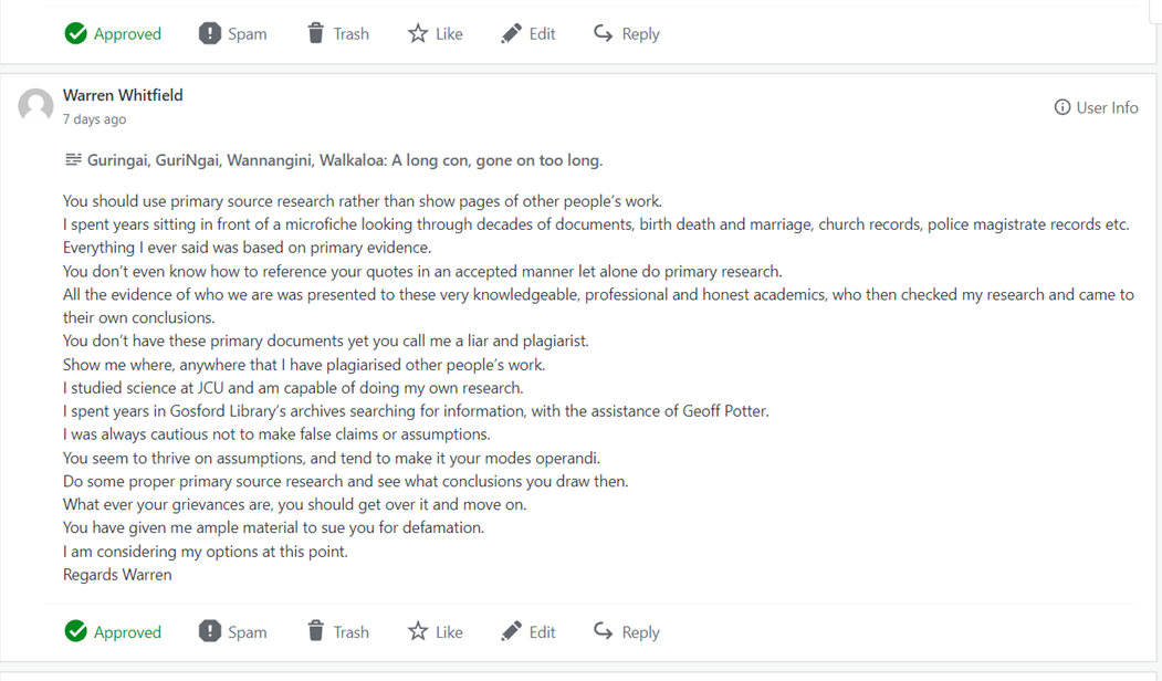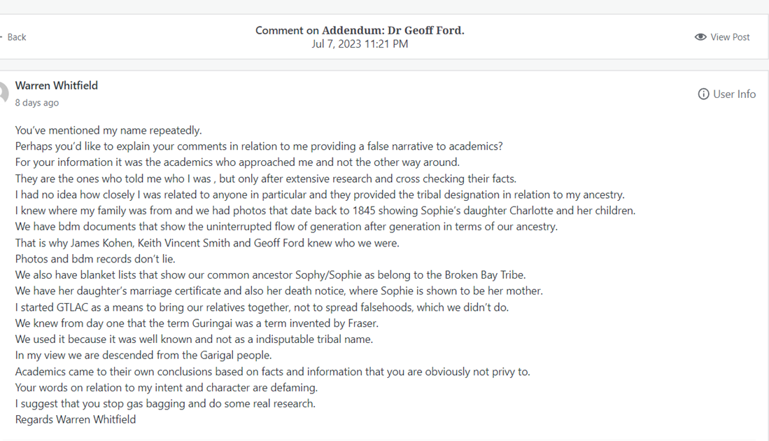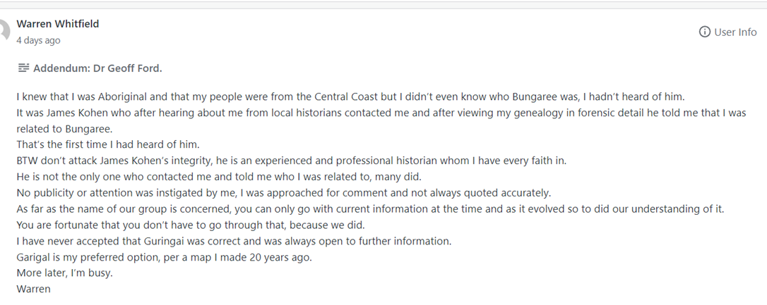 Warren Whitfield continued to post voluminously around everything but the lack of evidence connecting his fictional ‘Sophy’ to my ancestors Bungaree and Matora.