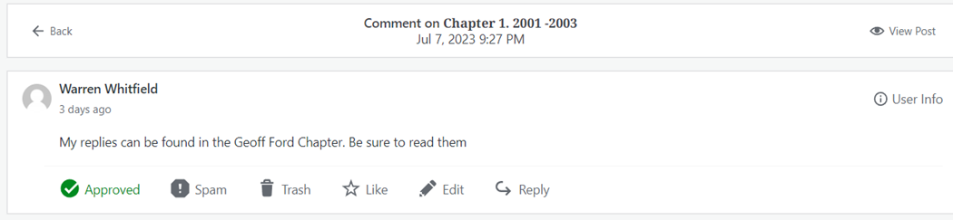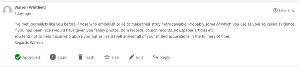 Here, during a meltdown in which Mr Warren Whitfield appears most concerned that the public is now aware of his plagarism, he copy and pastes the same comment multiple times.
