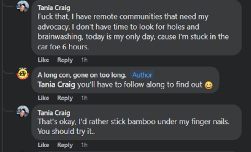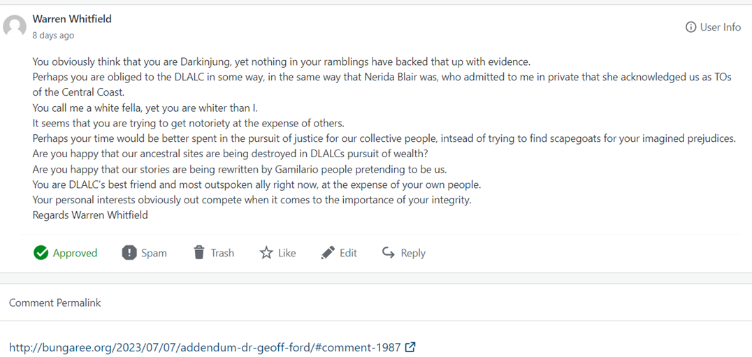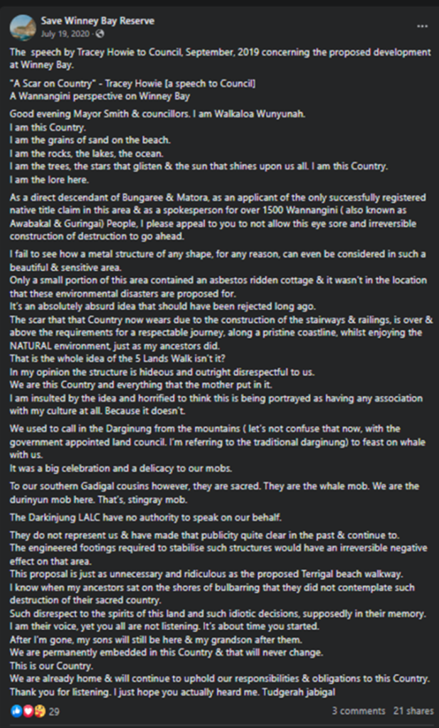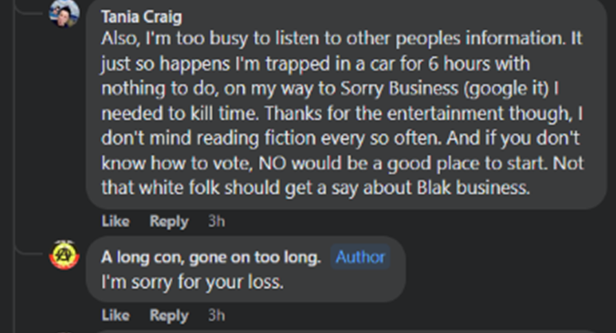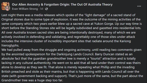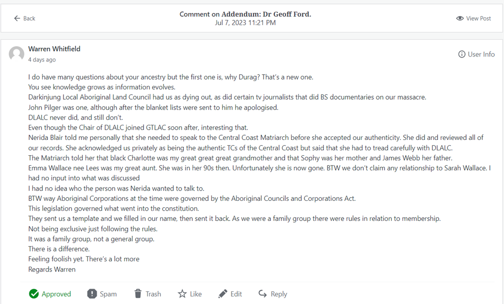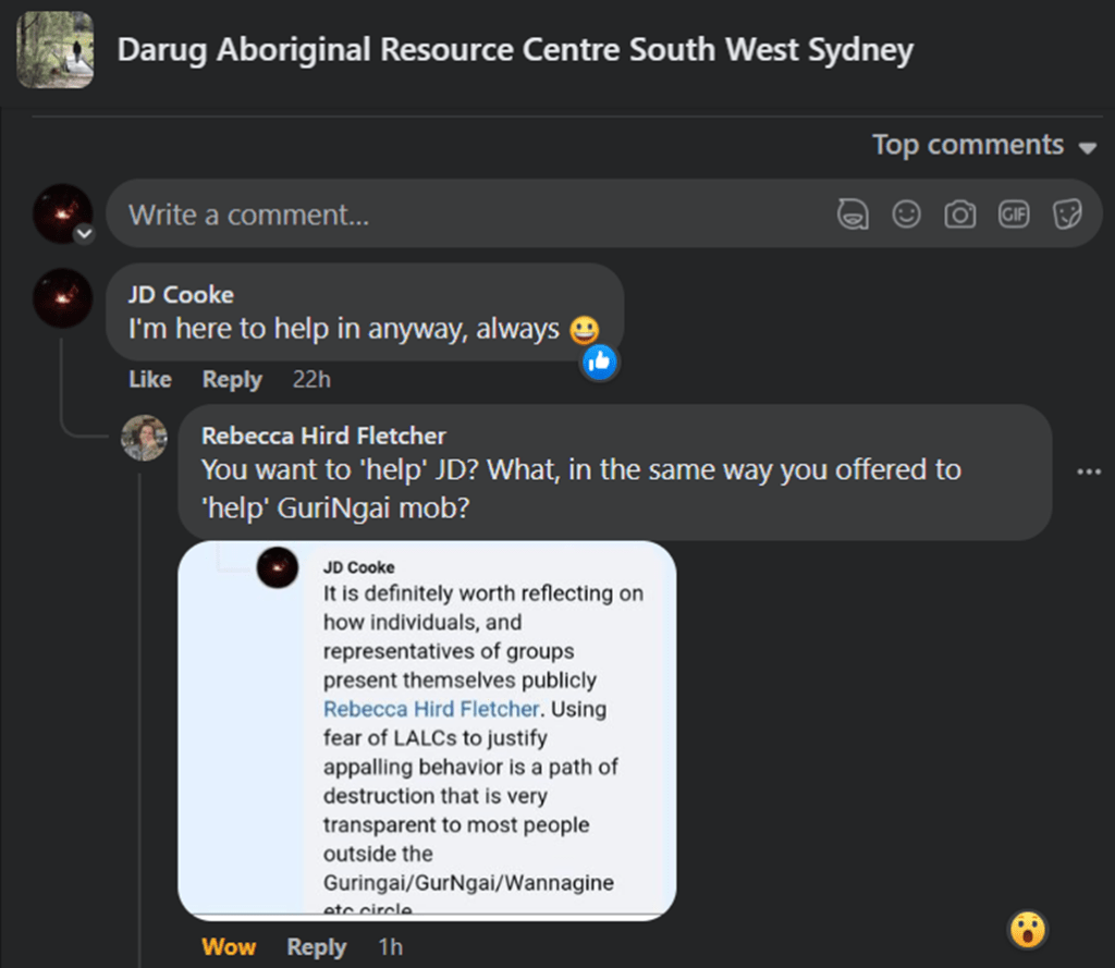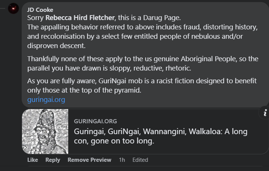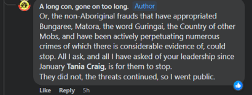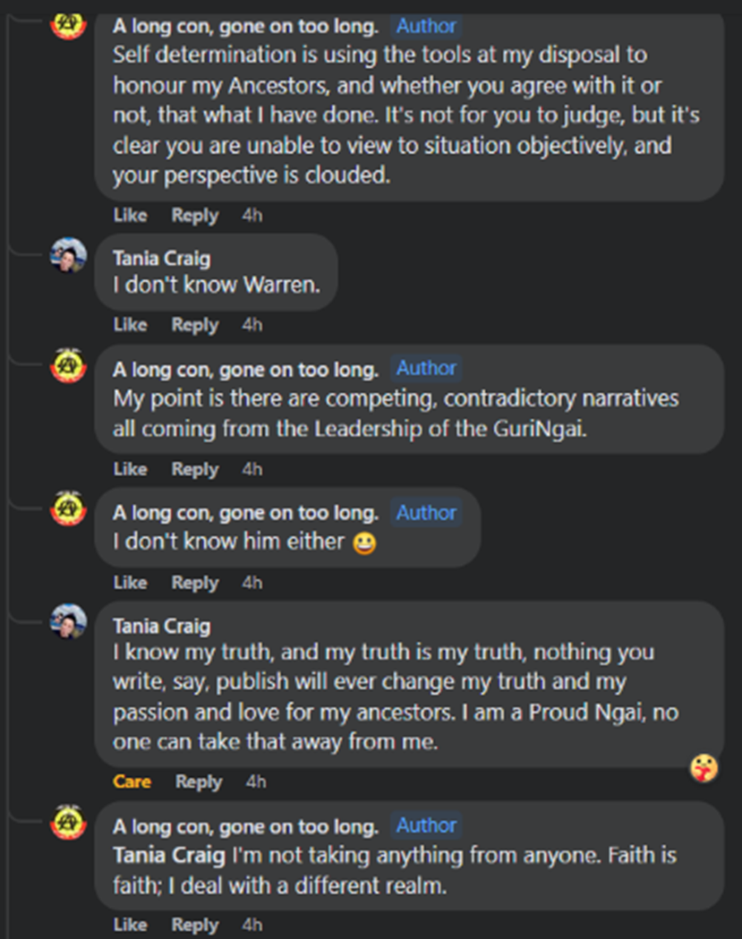 On 16/07/2023 Rebecca Hird Fletcher, a family member/affiliate of the GuriNgai, left the following comment on the A long con, gone on to long Facebook page.