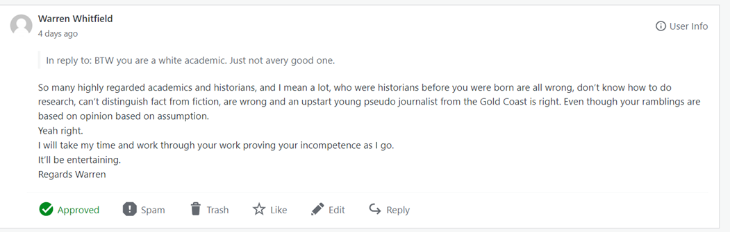 It wasn’t long before what was to be the first of many comments appeared, posted by the account Warren Whitfield, wj_whitfield@yahoo.com.au No website, 119.12.221.204