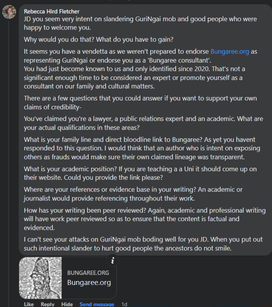 <It seems you have a vendetta as we weren’t prepared to endorse Bungaree.org as representing GuriNgai or endorse you as a ‘Bungaree consultant’.>