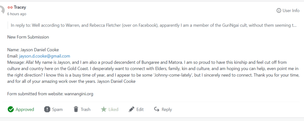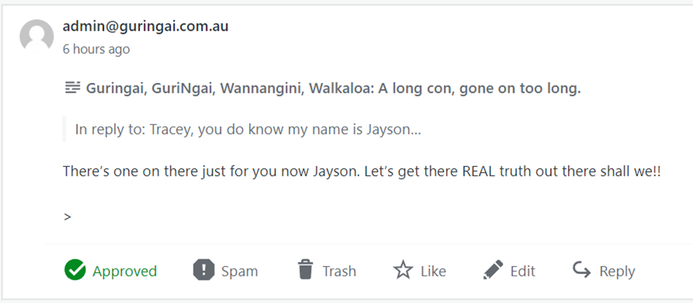 Another account writing as Tracey Howie begins to make use of the comments section of bungaree.org. Tracey admin@guringai.com.au No website 125.209.135.101