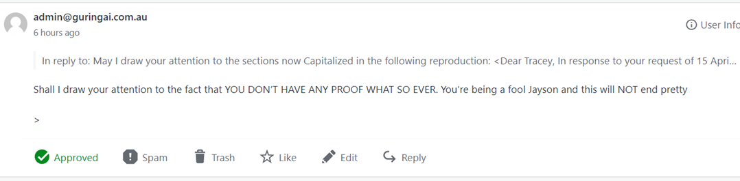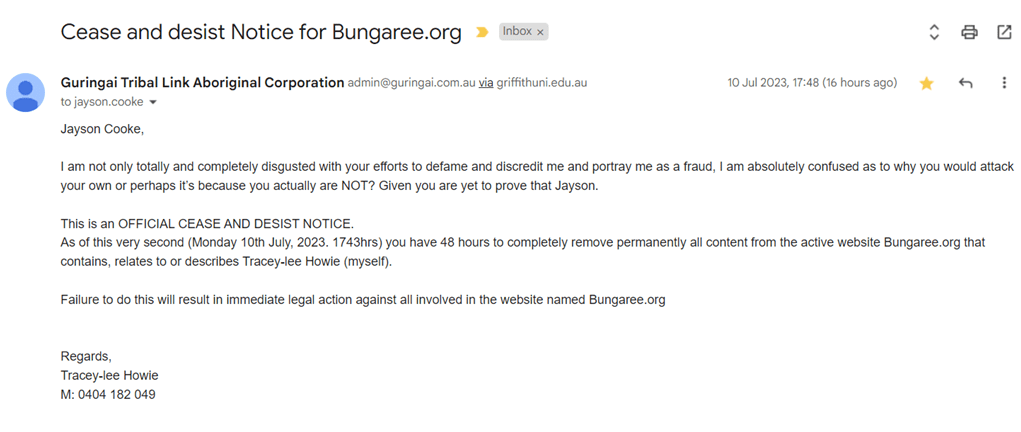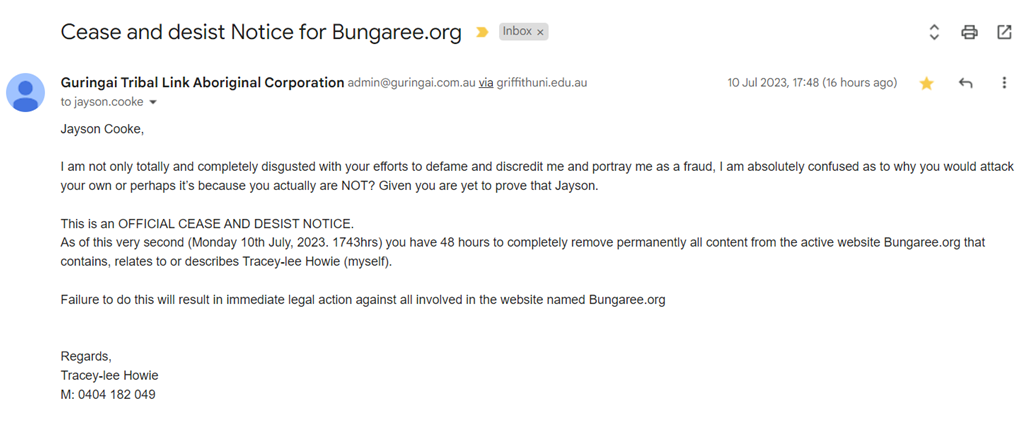 Frivolous and prima facie vexatious threats of litigation continue to be made by Senior Members of GuriNgai affiliated endeavors. The latest example comes from husband of Tracey-Lee Howie, and father of Kyle Howie, Warren John Howie.