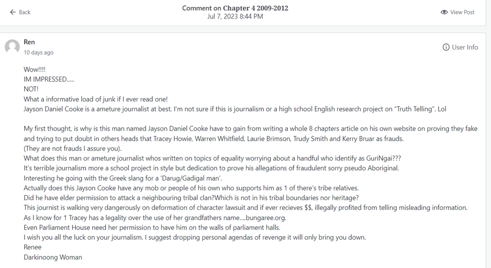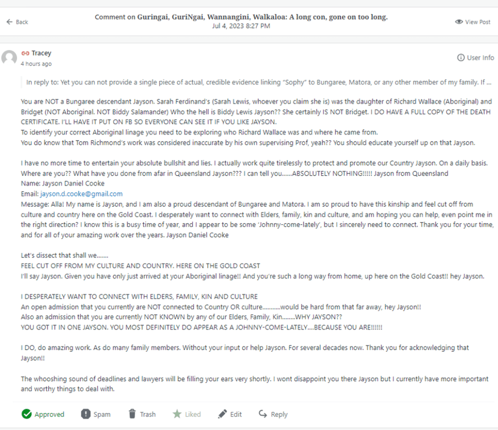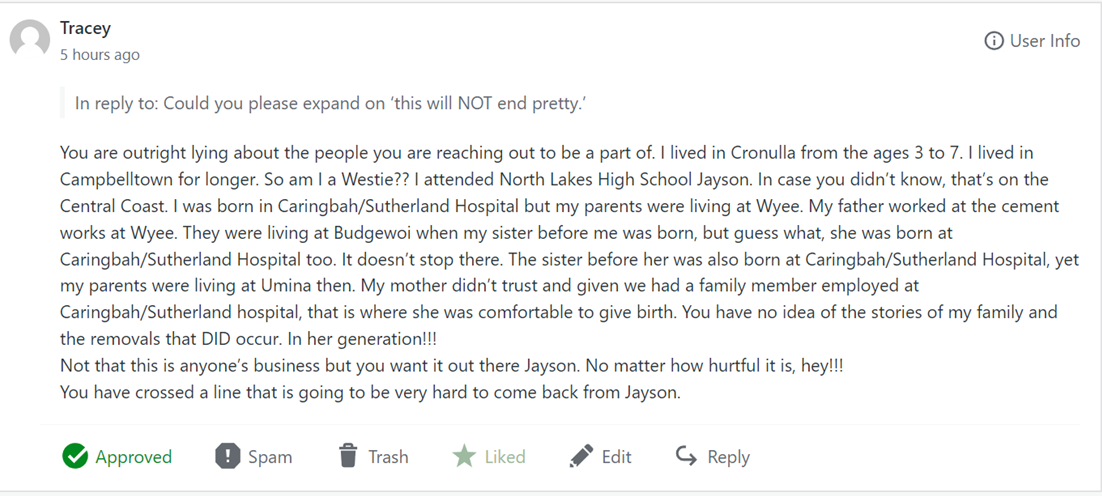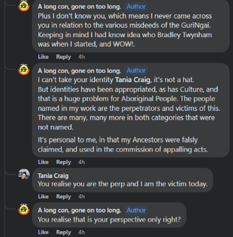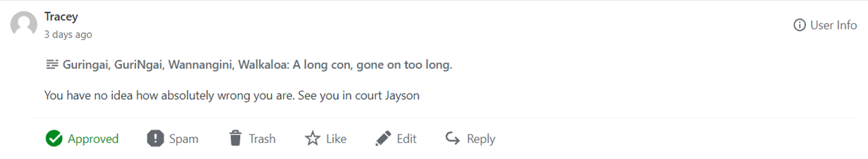 Within hours of making public what I believe to be compelling evidence of widespread, prolonged, and very intentional Cultural theft and misrepresentation by a small insular group of people primarily based on the Northern Beaches, and Central Coast regions of NSW, Tracey-lee Howie left this comment:
