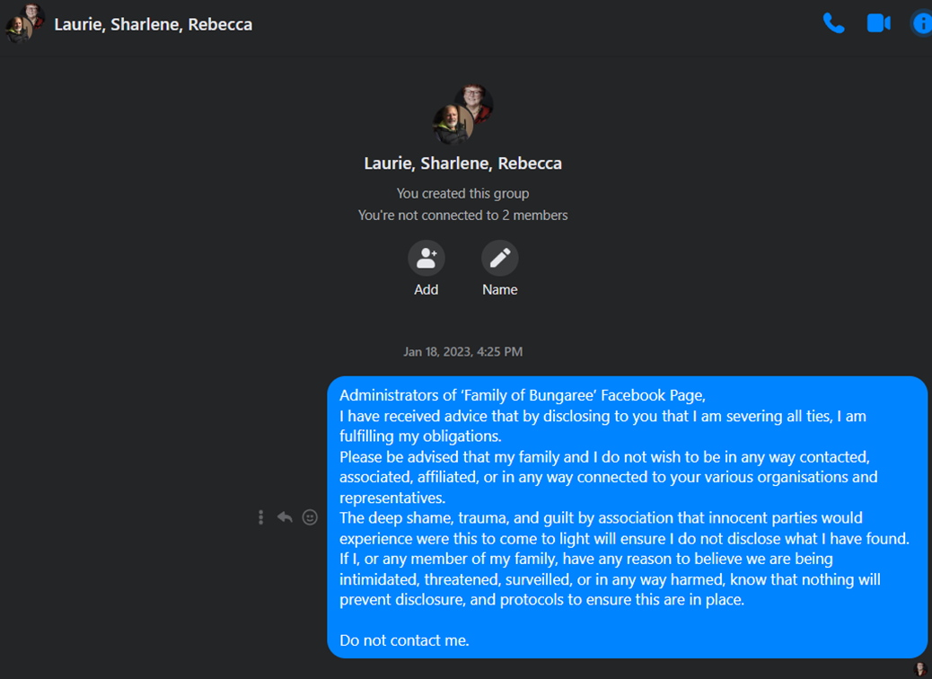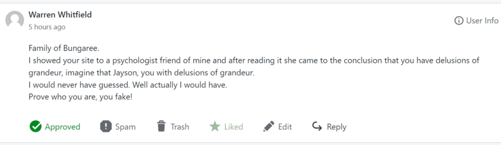 At approximately 5.07PM on Friday the 17th of August, 2023 I received a phone call on my mobile from 0438 877 509. I didn’t recognise the number, but answered anyway. My hello was met with “It’s Laurie Bimson, your cousin.” I was suprised to hear from Laurie, but he asked me about what Warren Whitfield was claiming on bungaree.org, and I explained some of the nonsense Whitfield had recreantly concocted. Then the conversation turned on a dime, with Laurie saying that because of what I had done, he had people there to kill me. I rushed to my computer and was able to record the rest of the conversation, which can be found here: