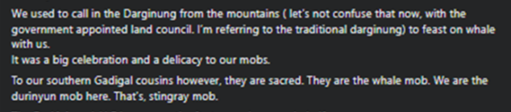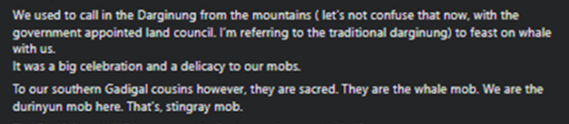 This fable of the Guringai singing the Whale in three times a year is contradicted by Tracey Howie’s 2020 speech to Council:
