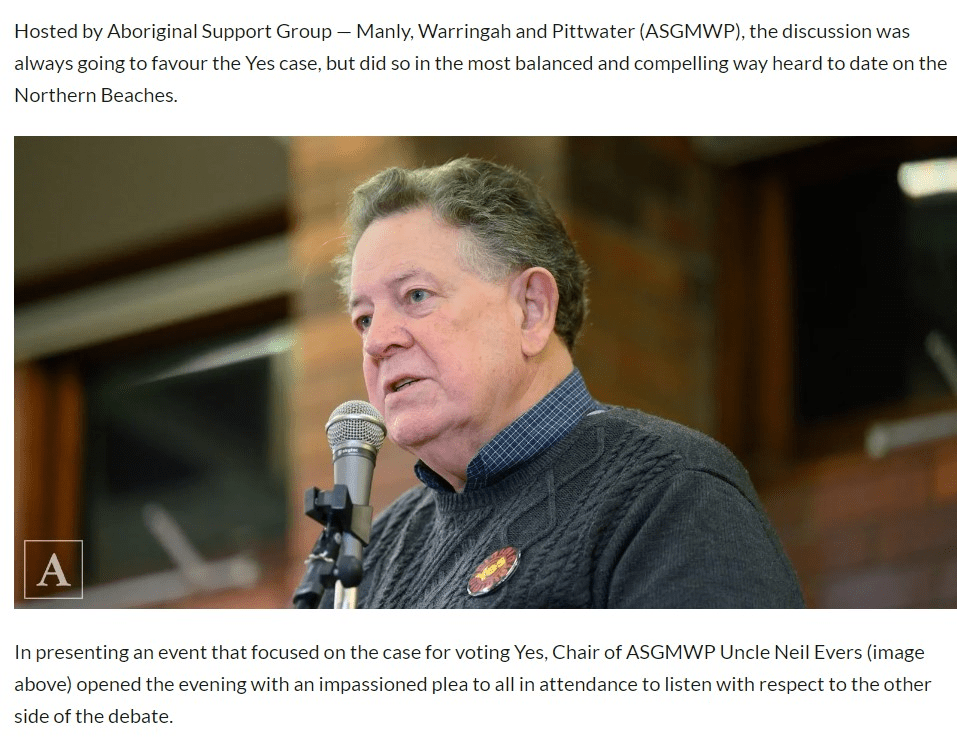 “In presenting an event that focused on the case for voting Yes, Chair of ASGMWP Uncle Neil Evers (image above) opened the evening with an impassioned plea to all in attendance to listen with respect to the other side of the debate.“