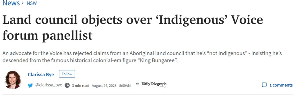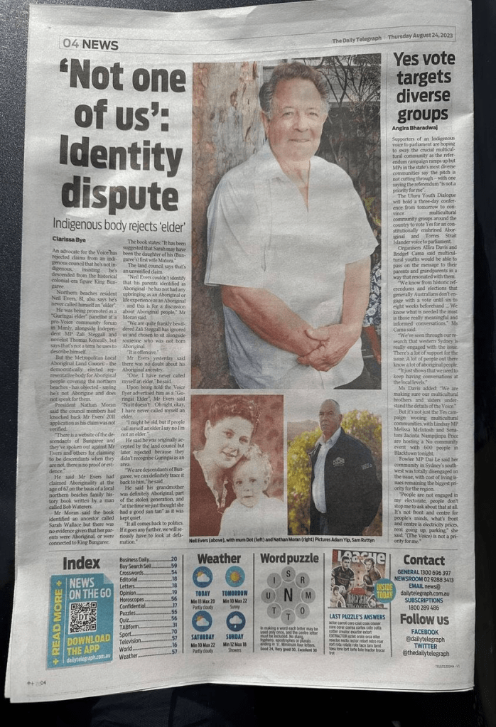 I had been curious why Neil Evers was appearing at events run in aid of the YES campaign for Constitutional Recognition of Aboriginal People, when his pseudo-Aboriginal ‘tribe’ are fiercely advocating for the NO side. Now it makes more sense: