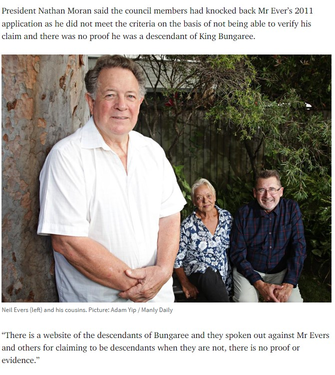 Curiously her confused understanding of Bungaree’s genuine genealogy precludes Bob Waterer, Neil Evers, and Laurie Bimson, and possibly even Dr Sharlene Leroy-Dyer, and Bradley Tywnham of their claimed descent from Bungaree.