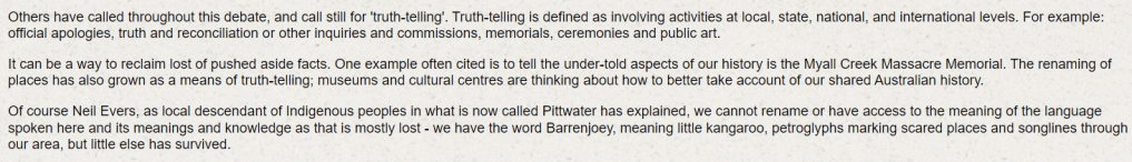“Of course Neil Evers, as local descendant of Indigenous peoples in what is now called Pittwater has explained, we cannot rename or have access to the meaning of the language spoken here and its meanings and knowledge as that is mostly lost – we have the word Barrenjoey, meaning little kangaroo, petroglyphs marking scared places and songlines through our area, but little else has survived.”