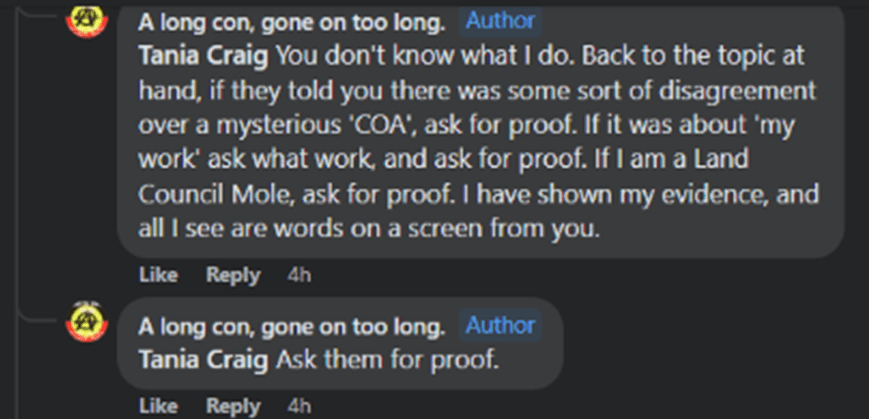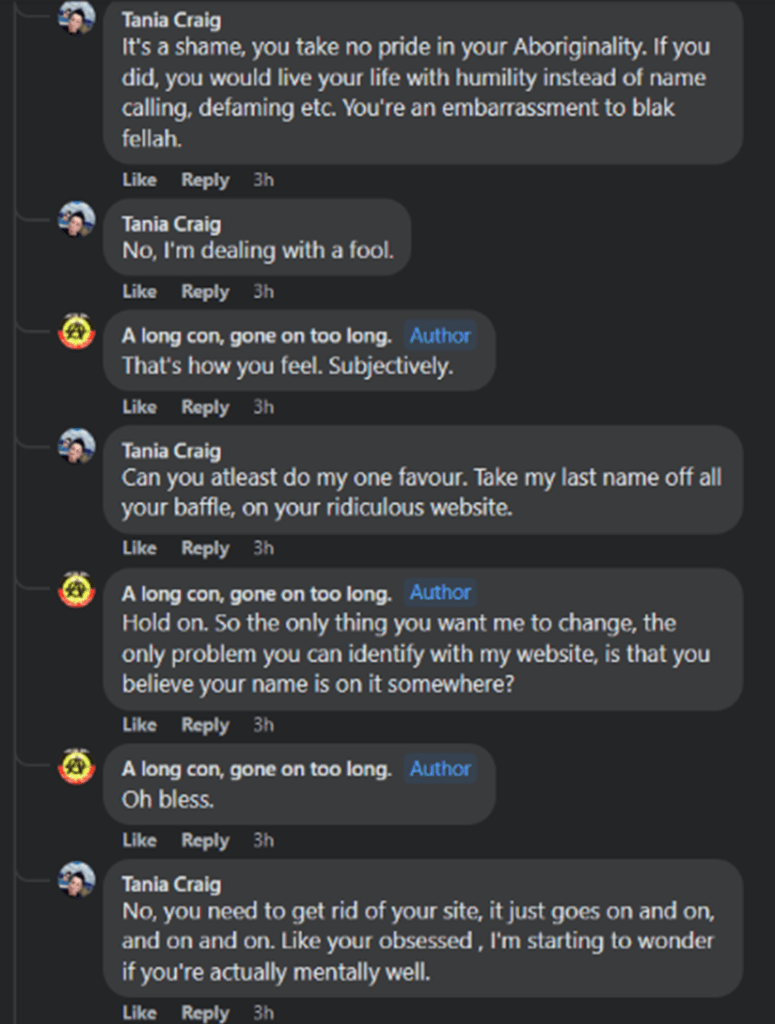The fine print at the bottom is Tracey-Lee’s excuse for not pursuing legal action against this Author (an empty threat made only days earlier) for pulling back the curtain on this hill-people circus black-cladding as Aboriginal People.