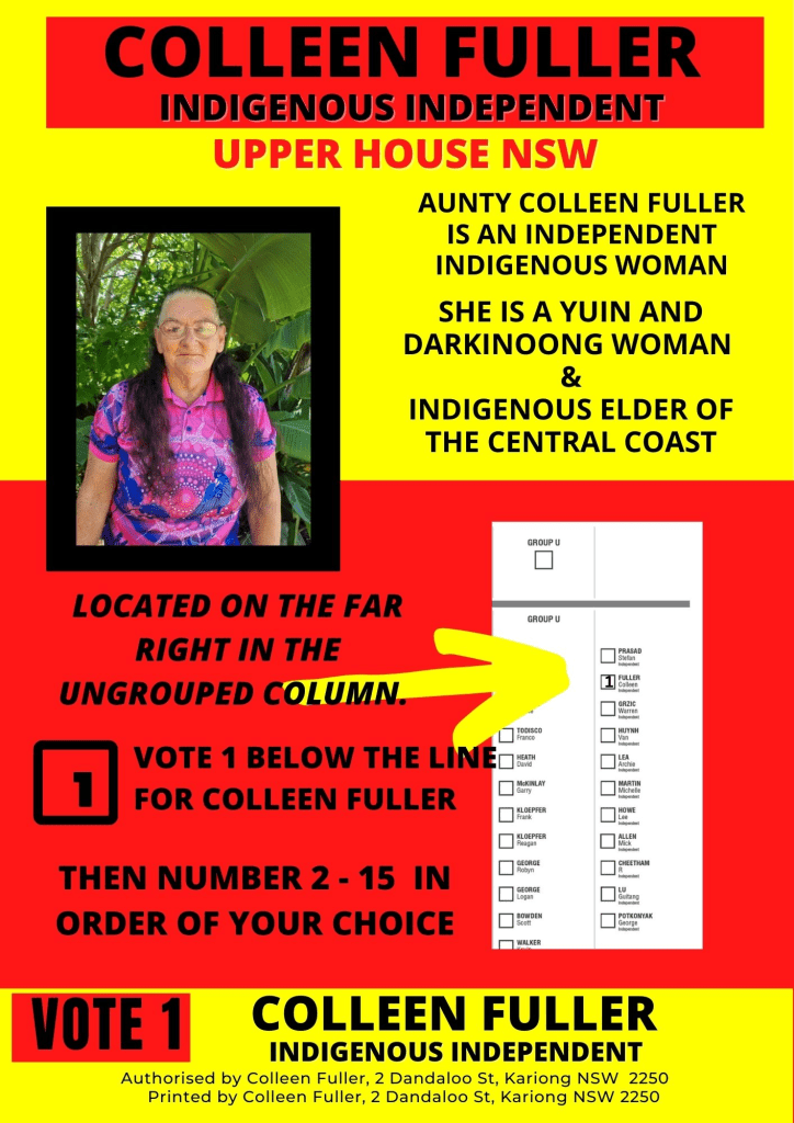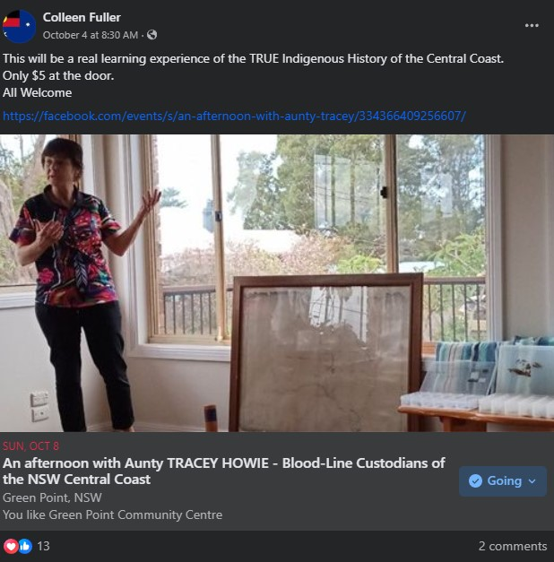 An associate of the race dysphoric GuriNgai of Northern Sydney and the Central Coast, Colleen Fuller has represented herself as an Aboriginal Person and an Elder, while urging her confused believers to Vote No in the referendum on Constitutional recognition for Australia’s Indigenous Peoples.