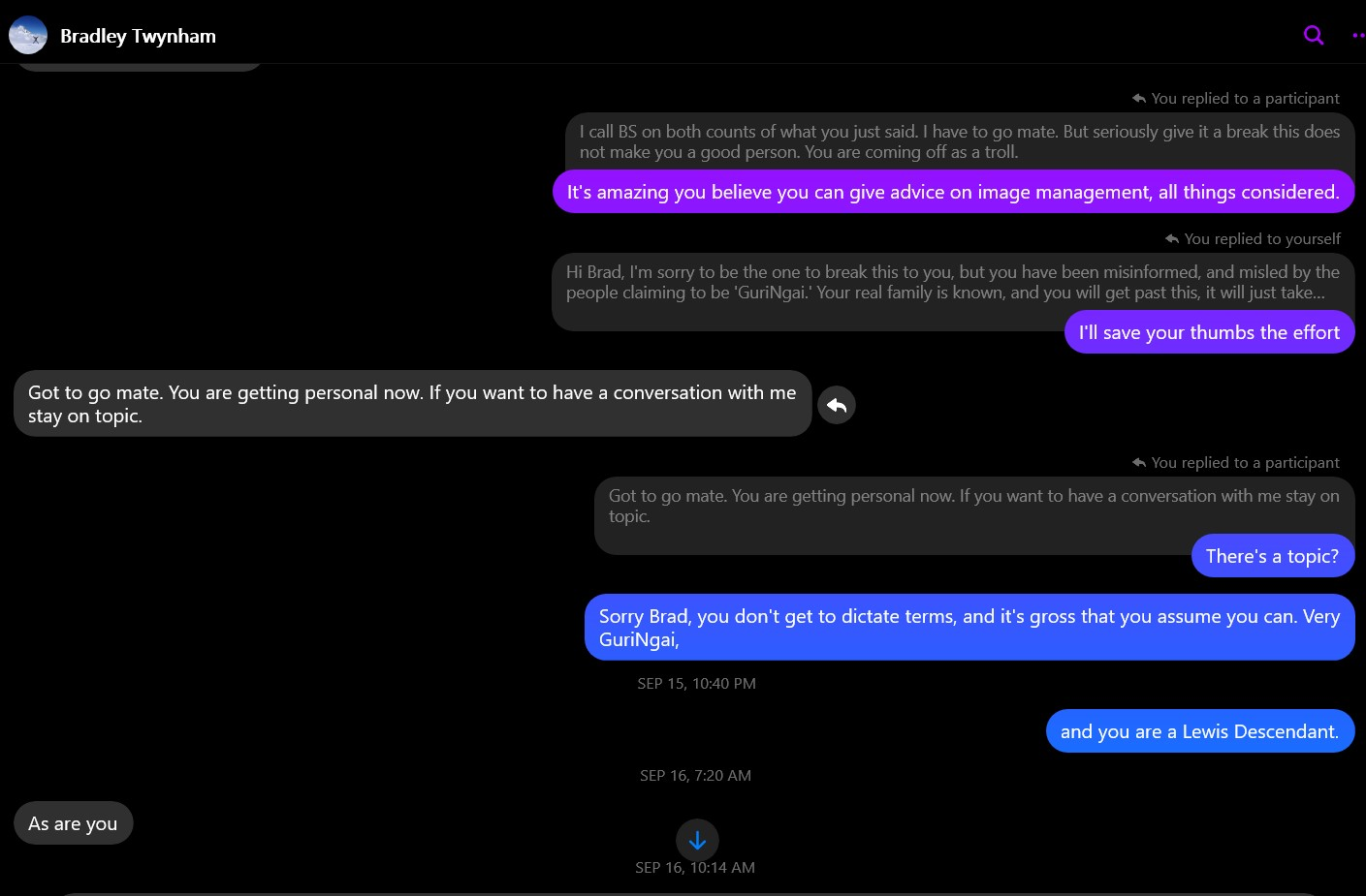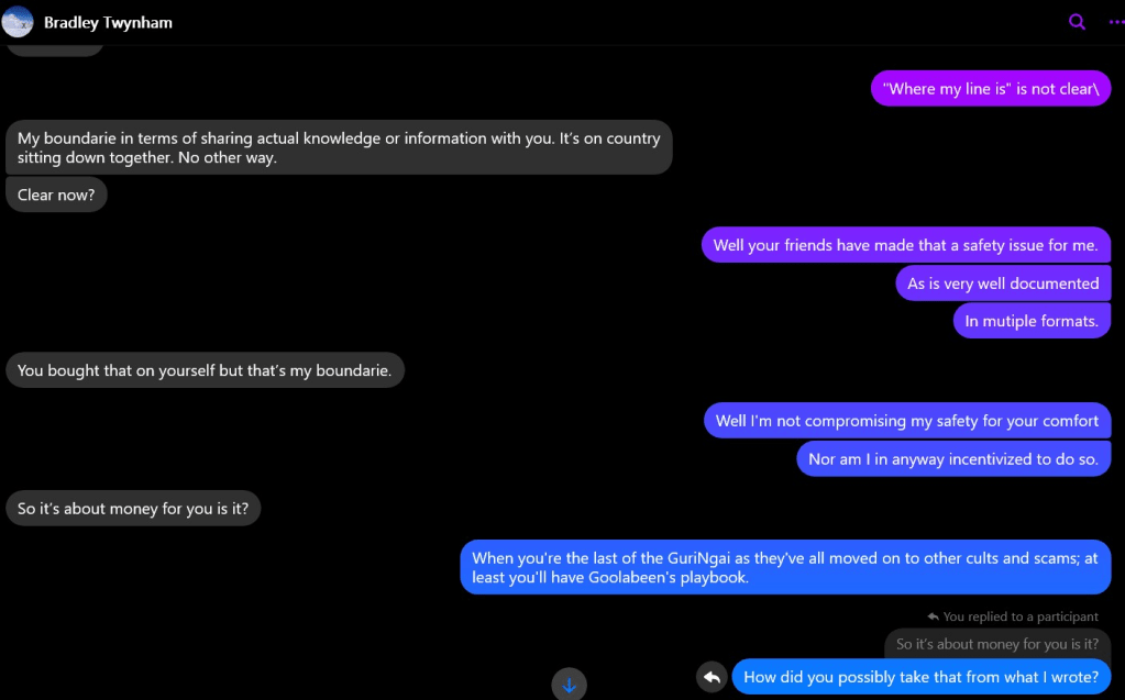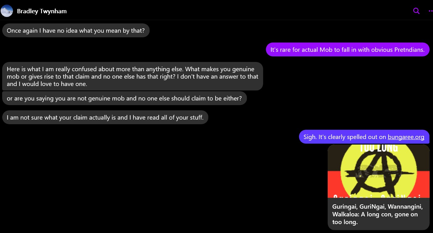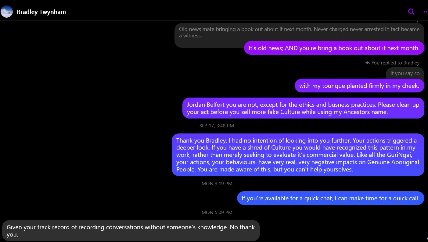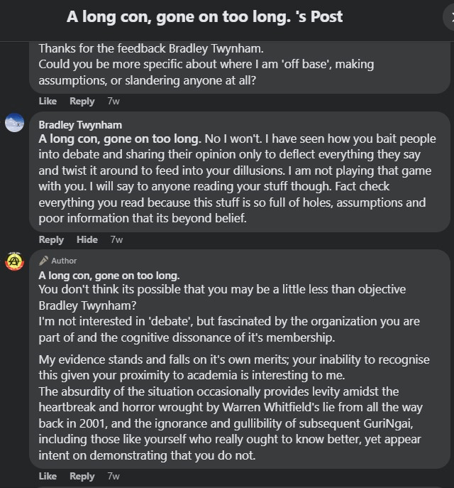 12. Bradley Twynham knows full well why I will not meet with him in person – the multiple credible threats to my personal safety by those involved in the GuriNgai farce, as documented withing A Long Con, Gone on Too Long.