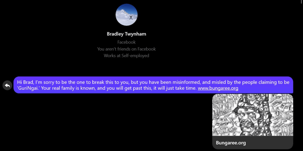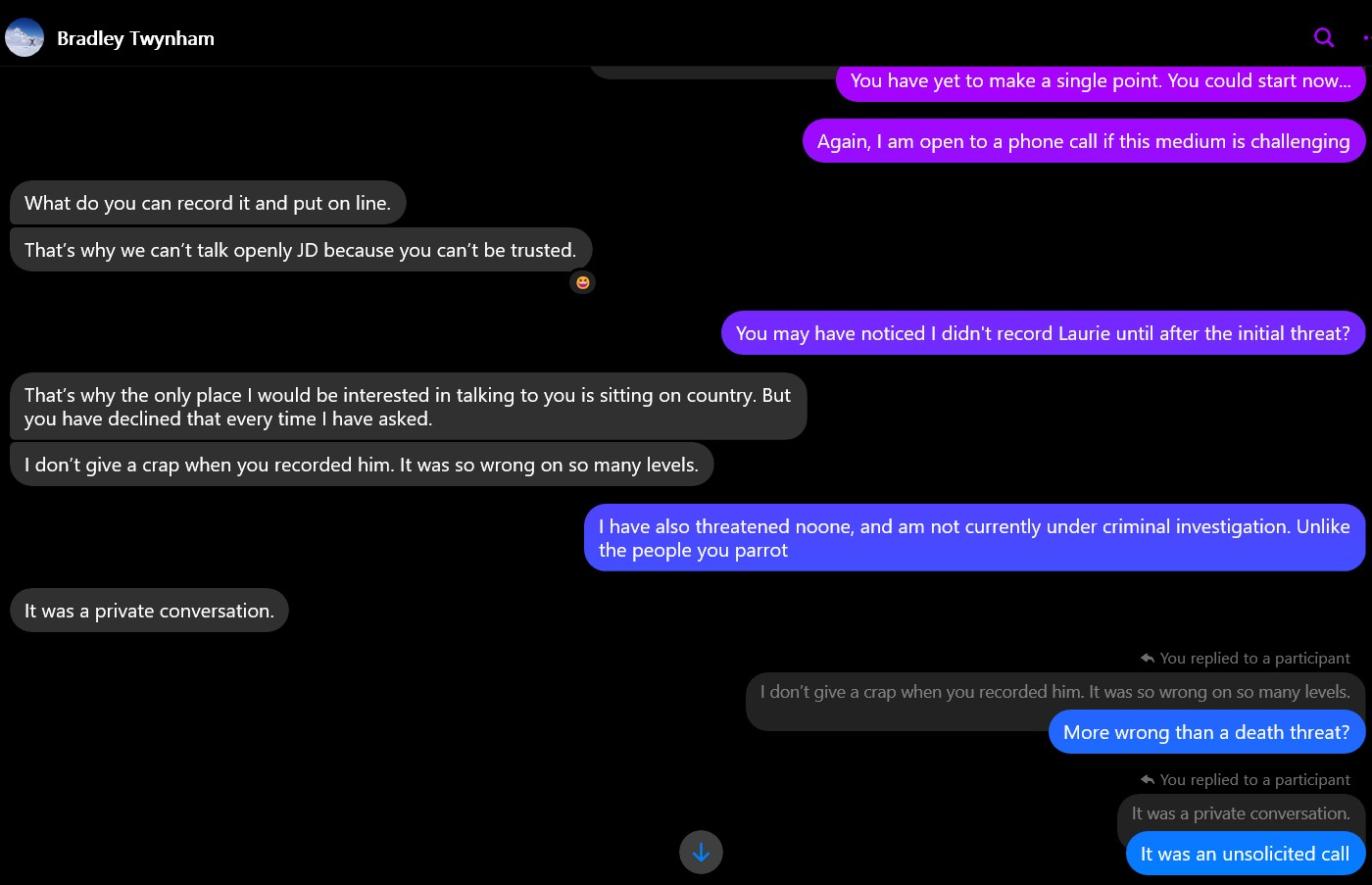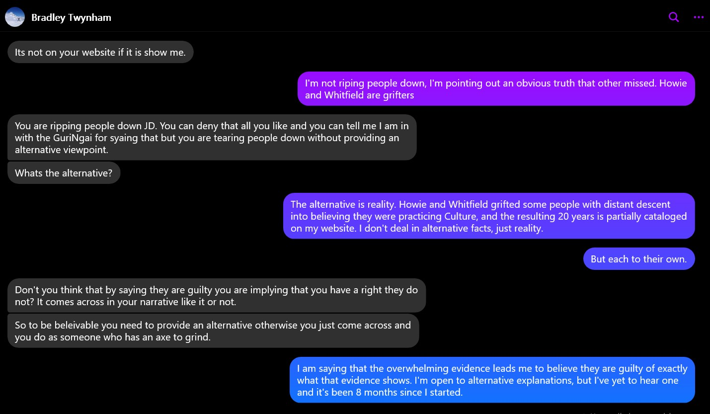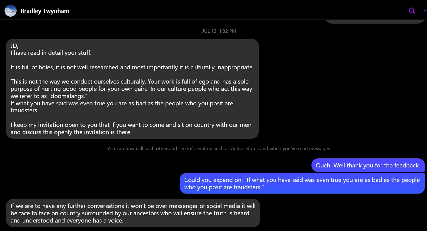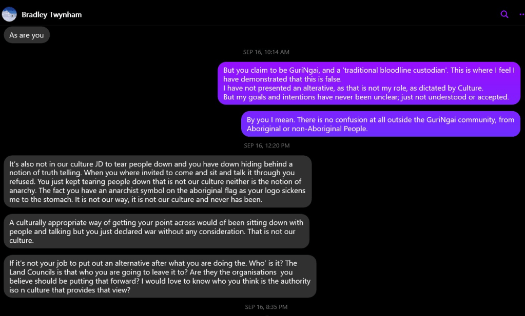 12. Bradley Twynham knows full well why I will not meet with him in person – the multiple credible threats to my personal safety by those involved in the GuriNgai farce, as documented withing A Long Con, Gone on Too Long.