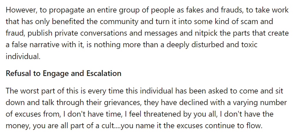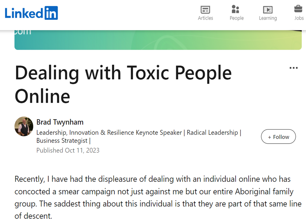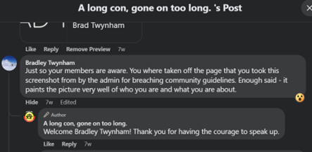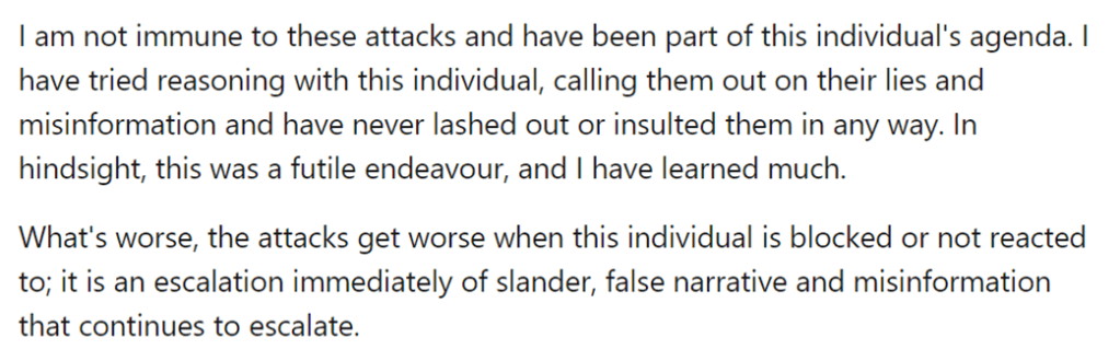 6. Bradley Twynham is defaming me, by claiming I have engaged in misinformation, blatant lies, mistruths, and bold assumptions with no fact-checking, peer review or academic research – I am considering my options.
