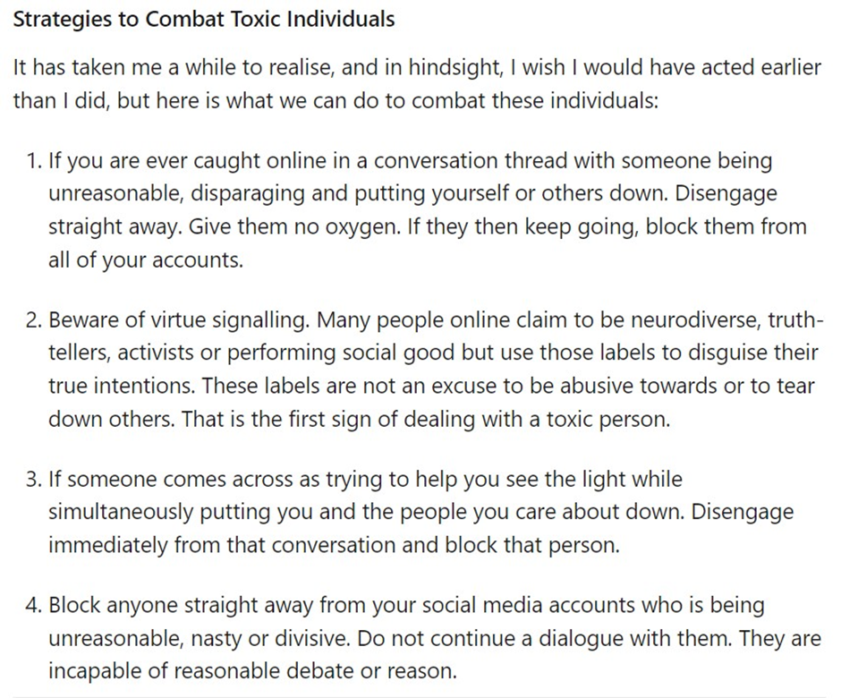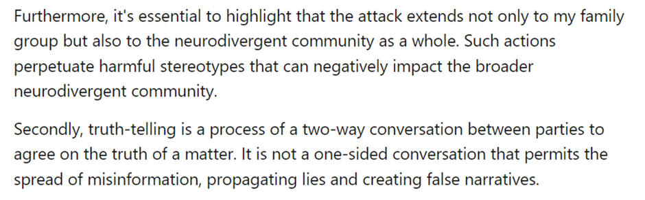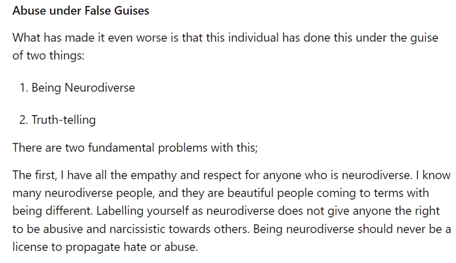 8. Were Bradley Twynham to, as he claims, “have all the empathy and respect for anyone who is neurodiverse” I expect our interactions, which are all fully documented, would be radically different to what they have been.