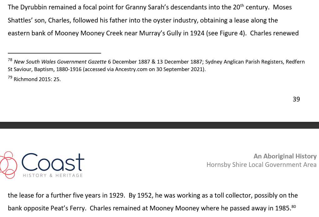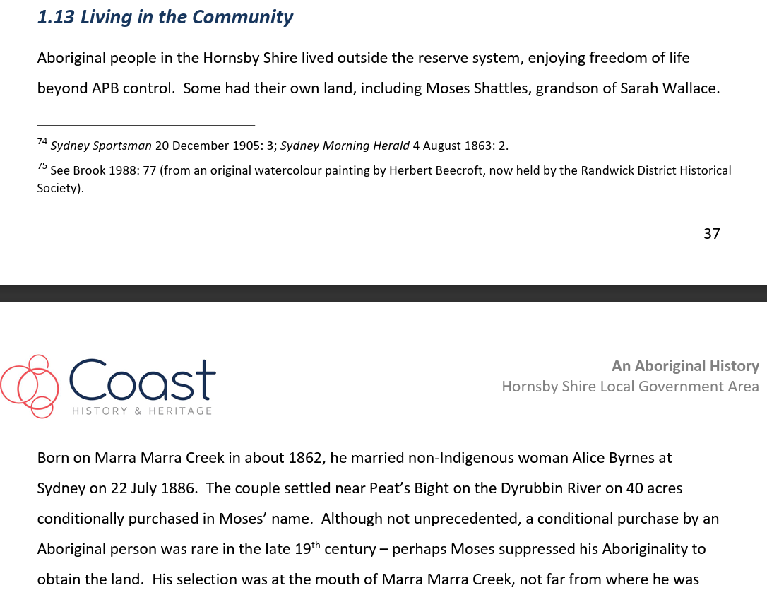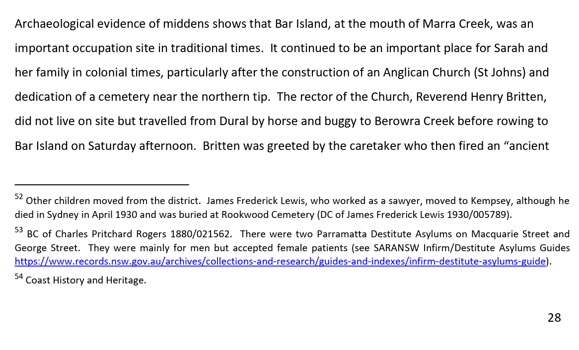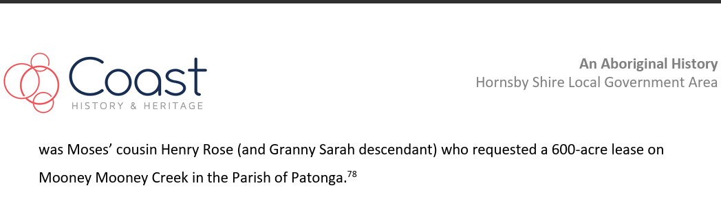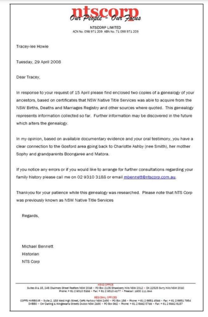 The report that featured the following egregious error/egregious lie from Dr Michael Bennett: “In my opinion, based on the available documentary evidence and you oral testimony, you have a clear connection to the Gosford Area going back to Chalotte Ashby (nee Smith), her mother Sophy and grandparent Boongaree and Matora.“