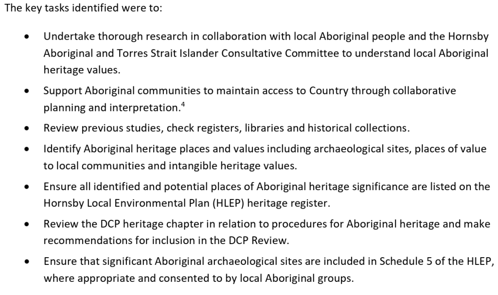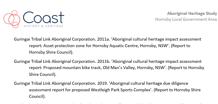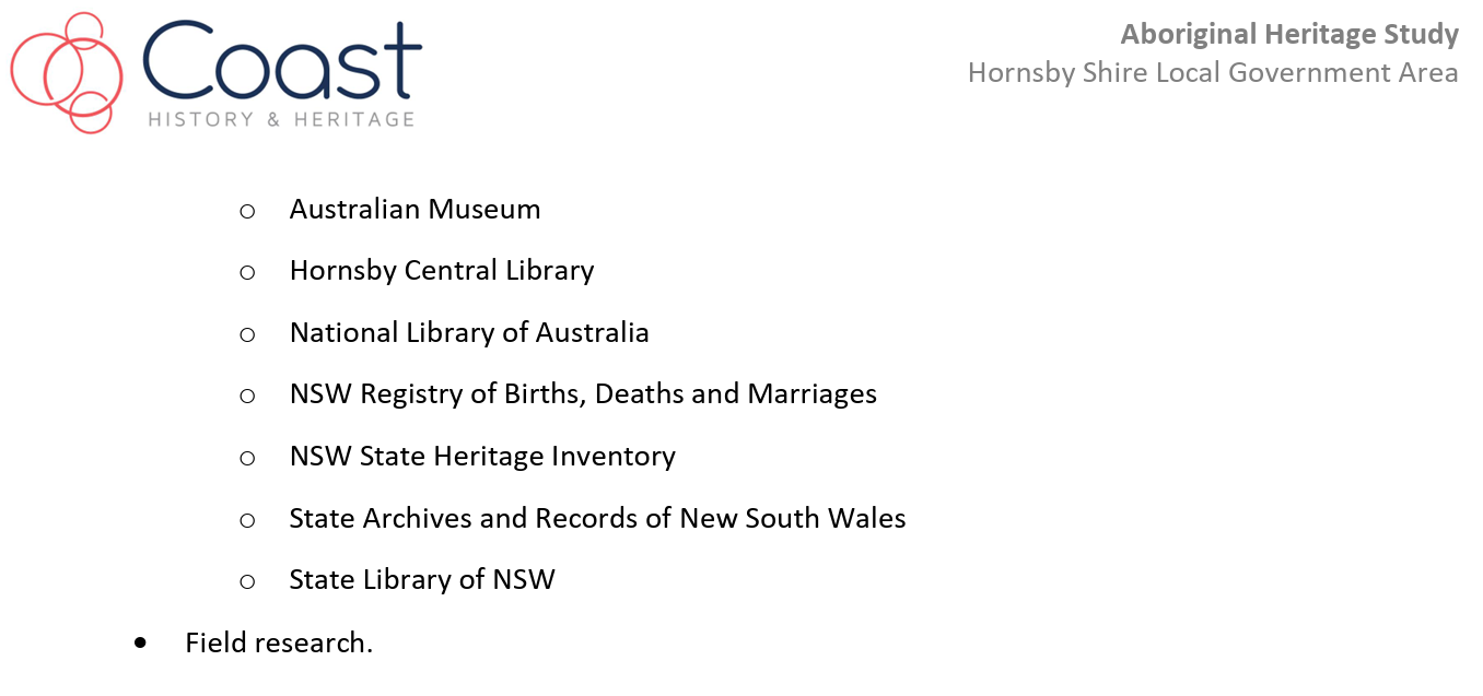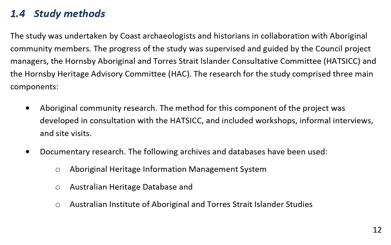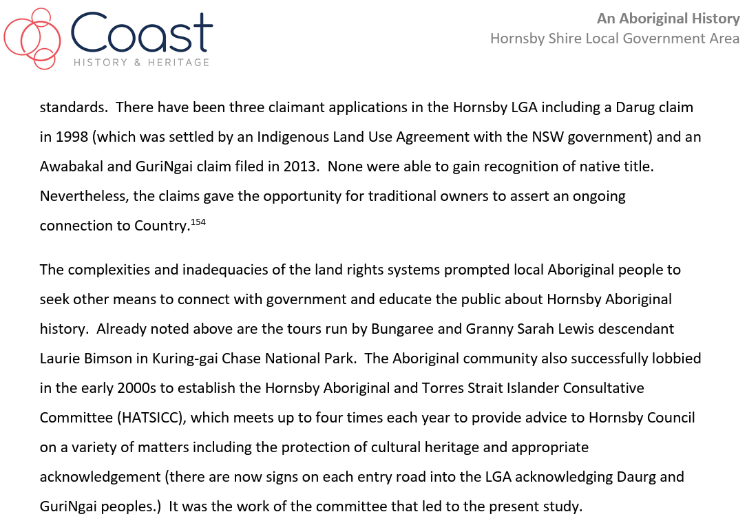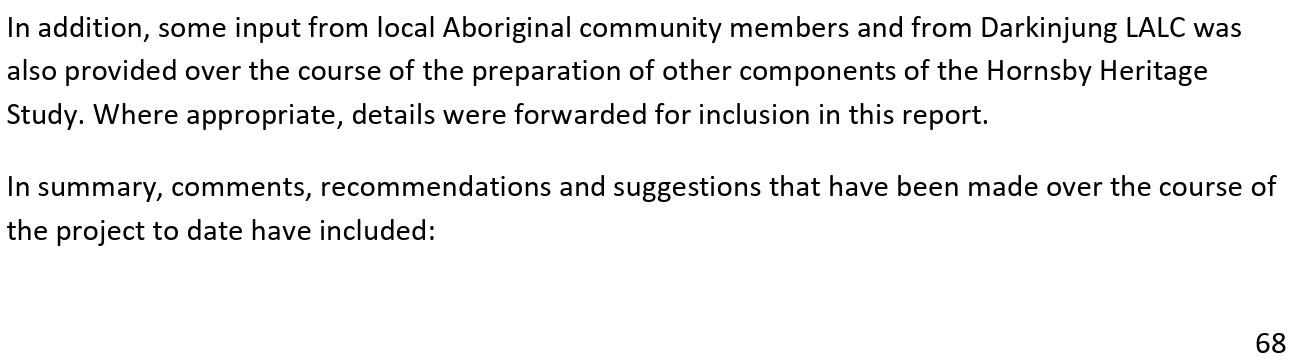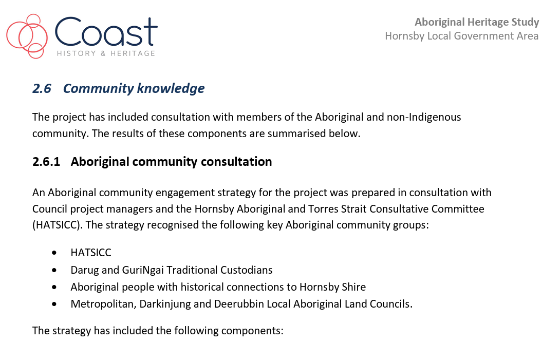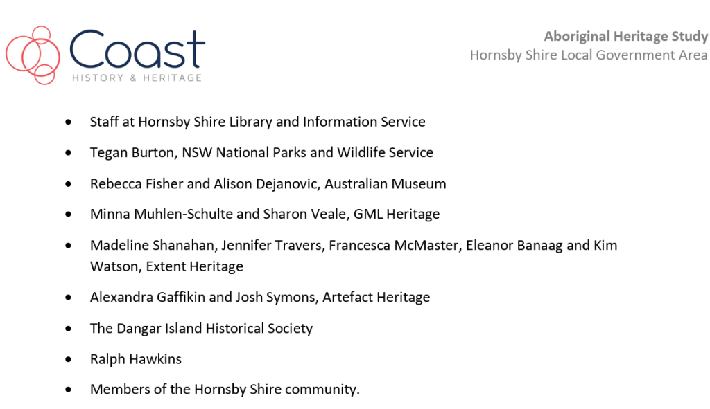 The progress of the study was supervised and guided by the Council project managers, the Hornsby Aboriginal and Torres Strait Islander Consultative Committee (HATSICC) and the Hornsby Heritage Advisory Committee (HAC).