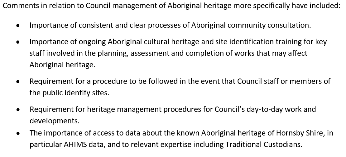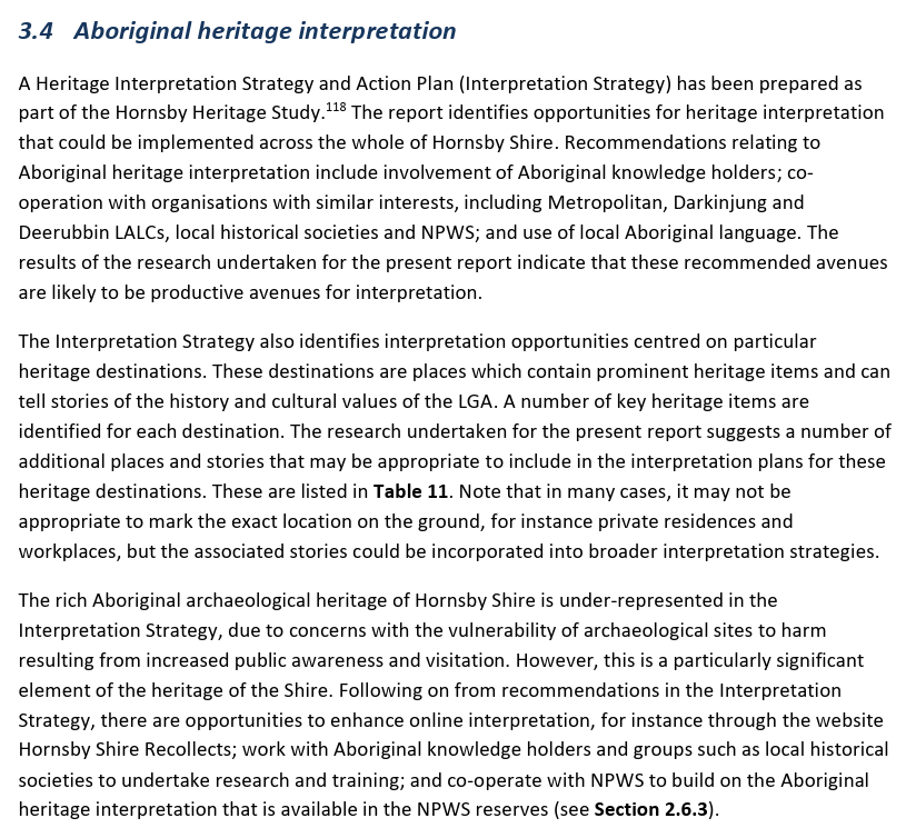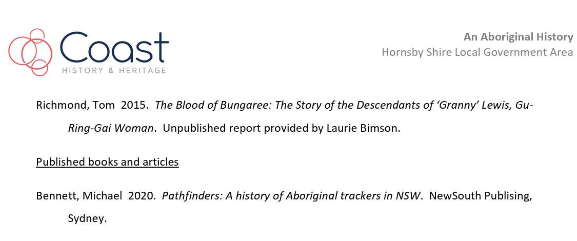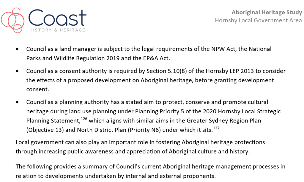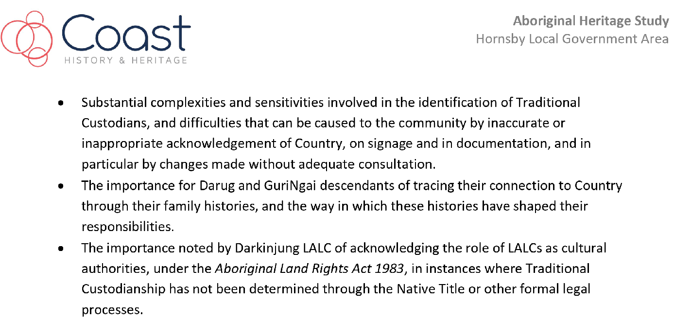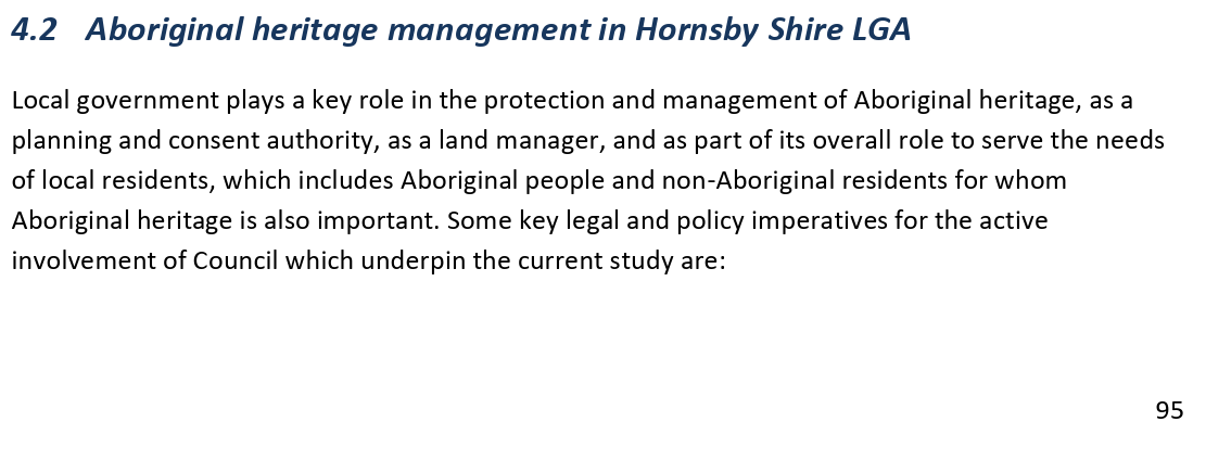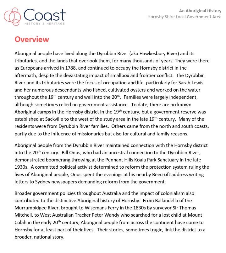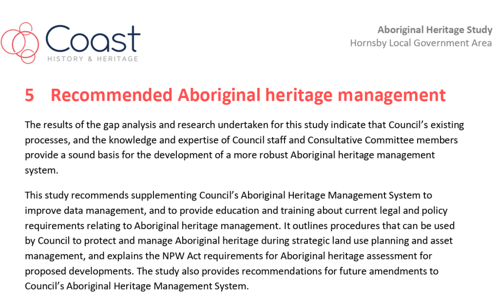 The progress of the study was supervised and guided by the Council project managers, the Hornsby Aboriginal and Torres Strait Islander Consultative Committee (HATSICC) and the Hornsby Heritage Advisory Committee (HAC).