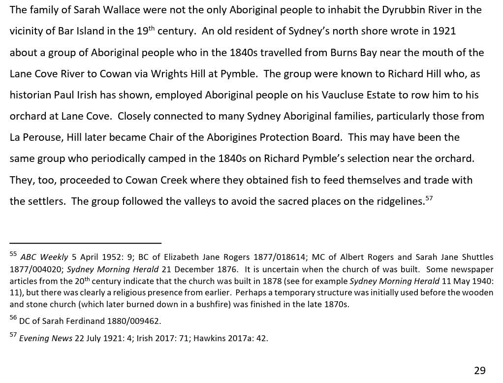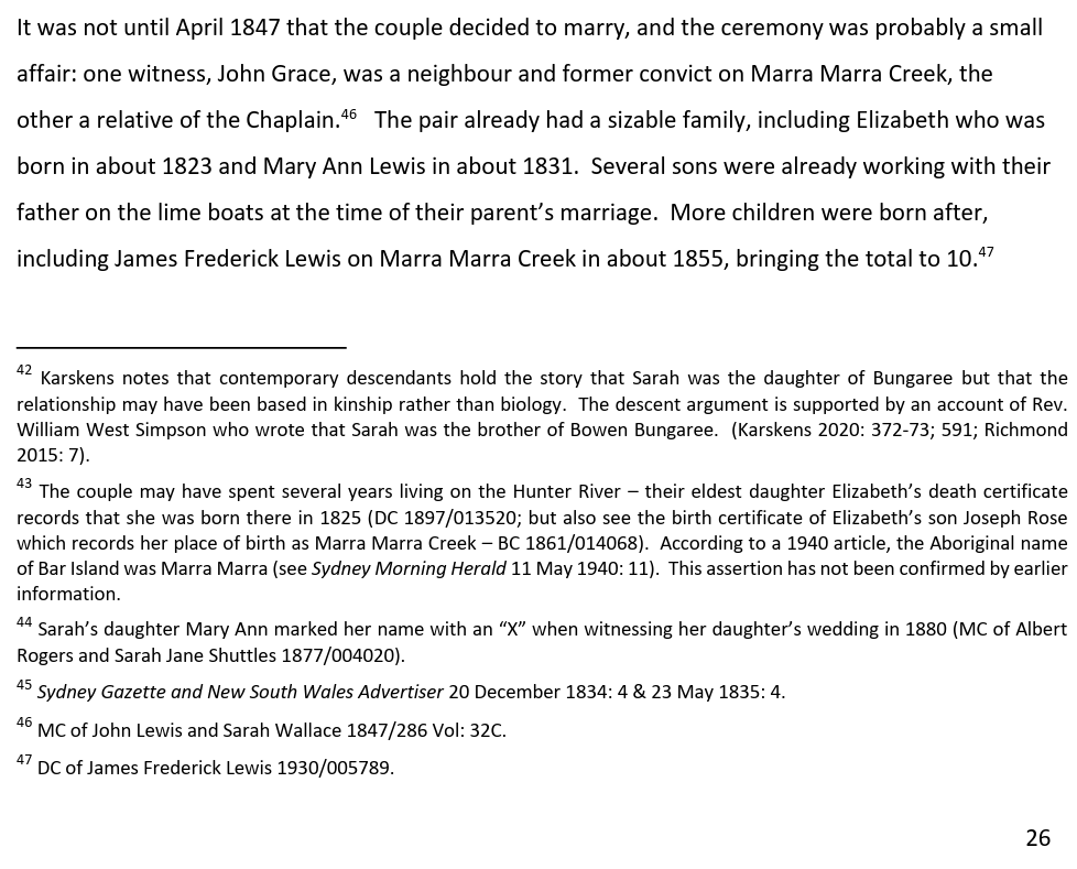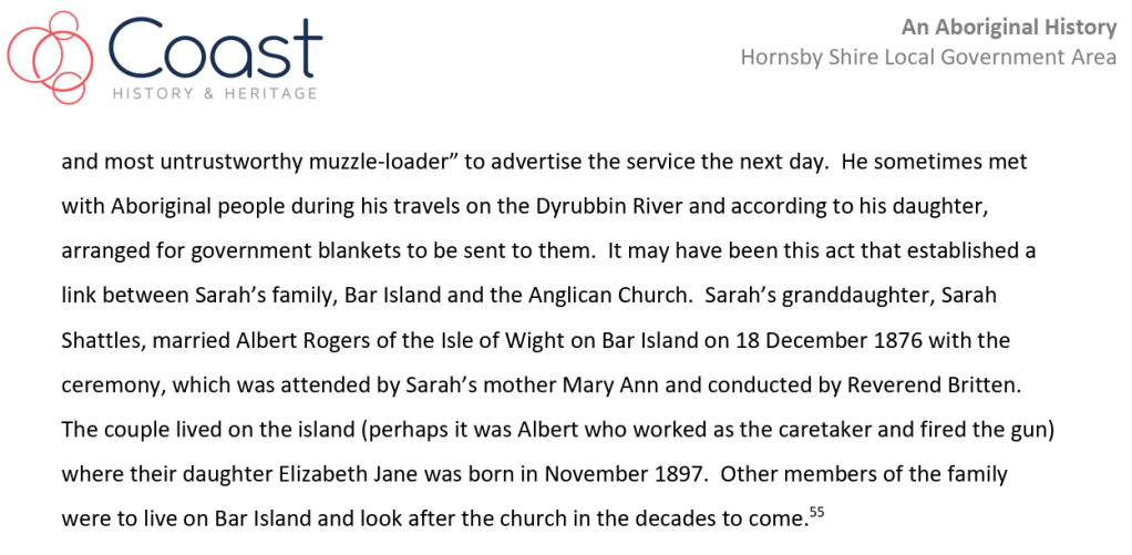 Sarah Wallace is claimed by Laurie Bimson, Neil Evers, Bob Waterer, and many more members of the GuriNgai to be their bloodline connection to Bungaree and Matora. If what is claimed here is true, then those people’s claims to be descendants of Bungaree would be false.