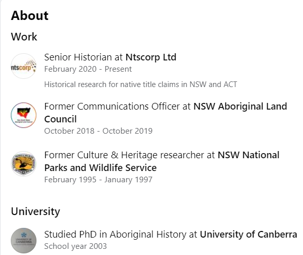 Tracey Howie, Kyle Howie, Laurie Bimson and Tony Bimson claim to be GuriNgai descendents, but they are not. They are not Aboriginal People, and are not accepted as Aboriginal People in the Communities in which they live.