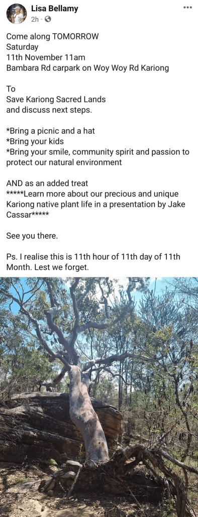On Remembrance Day, 2023 – Kariong resident and local gadfly Lisa Bellamy decided an Public Event in a National Park, at exactly 11AM, was the ideal time to discuss their ‘next steps.’