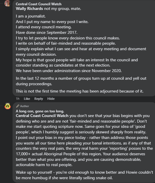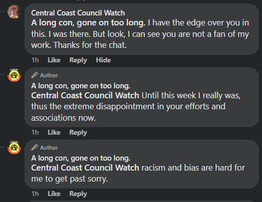 One of the pieces mentioned was authored by one Merilyn Vale, the owner of blog and social media brand ‘Central Coast Council Watch.’