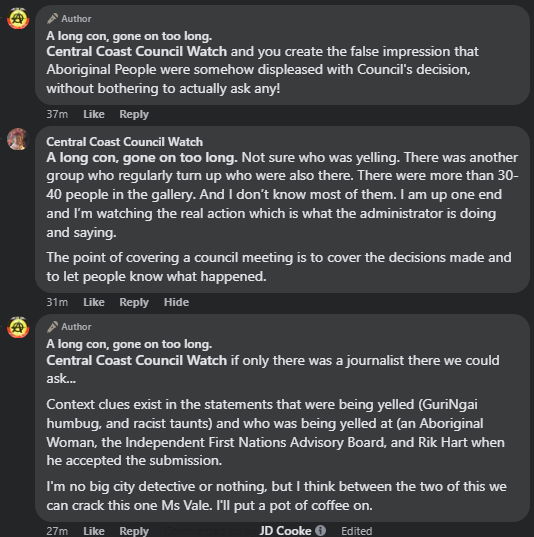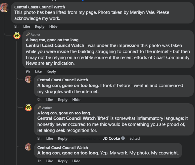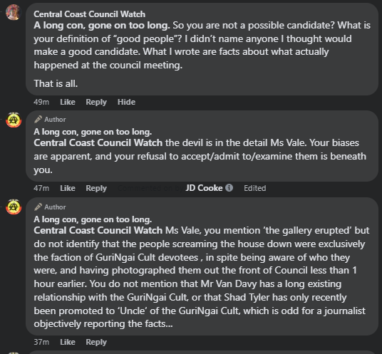 One of the pieces mentioned was authored by one Merilyn Vale, the owner of blog and social media brand ‘Central Coast Council Watch.’