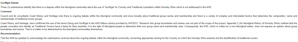All eyes are on Hornsby Shire Council right now, and more people are aware of the GuriNgai being a modern fiction than ever before. It will be interesting to see if tonight’s meeting will reflect that reality, or is Mayor Ruddock is determined to sink his own ship twice in one week over the same issue.