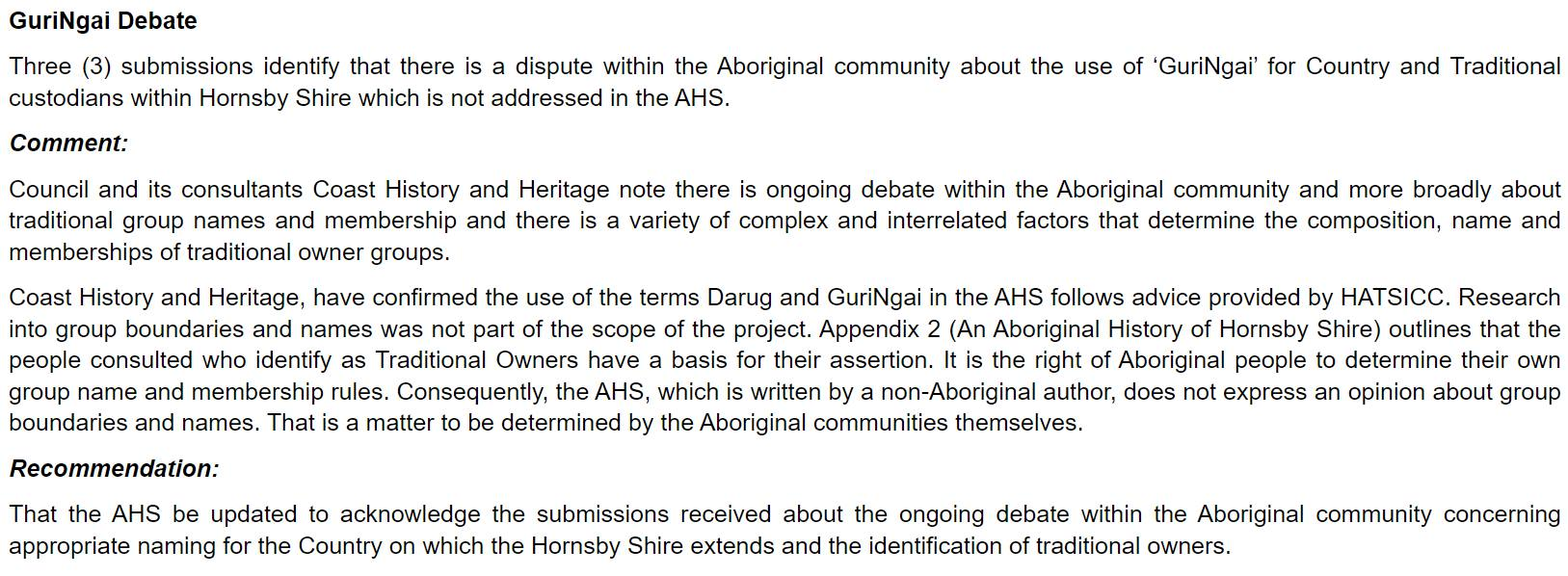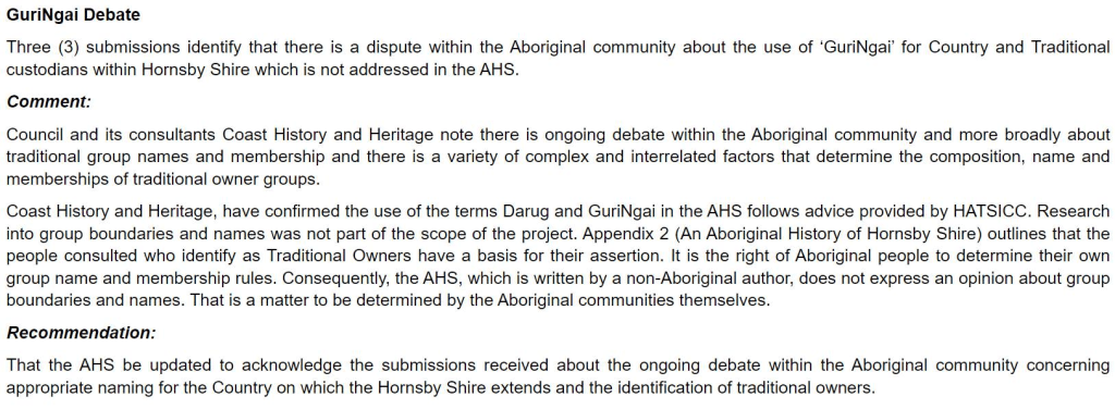 From the business papers attached to tonight’s Hornsby Shire Council meeting, we find reference to what the esteemed Councillors of Hornsby Shire, and it seems Mayor Phillip Ruddock, have been convinced of by non-Aboriginal GuriNgai Cult leaders Tracey Howie and Laurie Bimson, formerly reffered to in Official Coucil Documents as the ‘GuriNgai Debate’.
