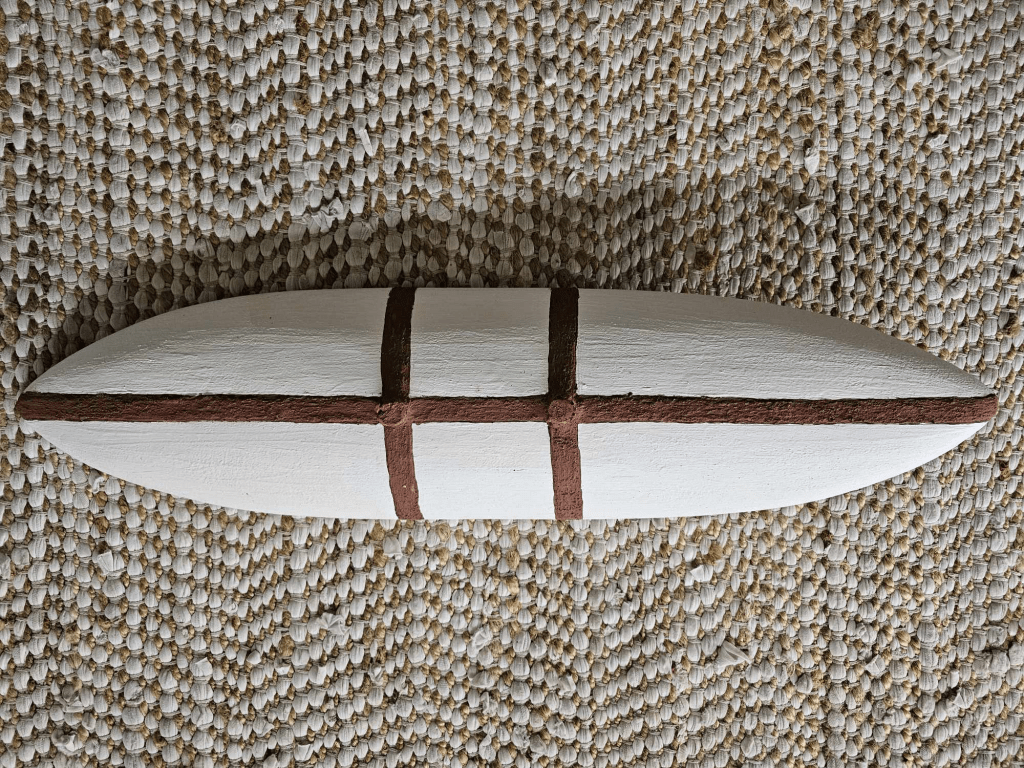 The boomerangs are 80cm from tip to tip the mangrove shield is 33 inches x 10 inches wide mangrove handle and painted with white pipe clay and red ochre. The hard wood Boomerangs are myall tree and the nulla- nulla or Bondy also Myall tree.