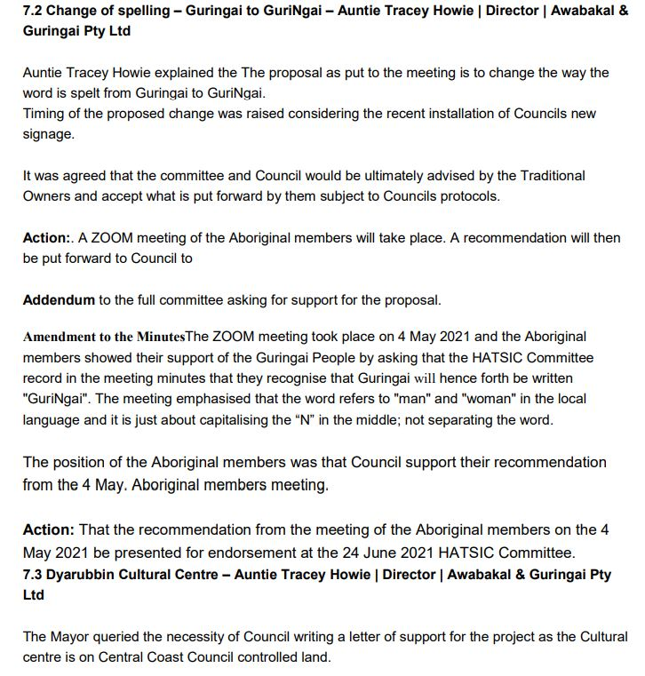 The Hornsby Aboriginal and Torres Strait Islander Consultative Committee (HATSICC) were satisfied of the GuriNgai legitimacy, because the GuriNgai told them they were legitimate, explained away contradictory facts and evidence, and this was all it took to gain the recognition and support of Hornsby Shire Council, and Dr Mariko Smith.