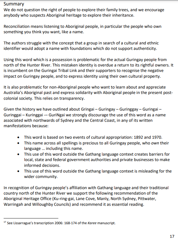 In 21 pages, this paper provides a concise guide to the historical evidence base of how and when genuine Aboriginal names such as Guringai were misinterpreted by non-Aboriginal sources, and some of the harmful consequences that result from this.