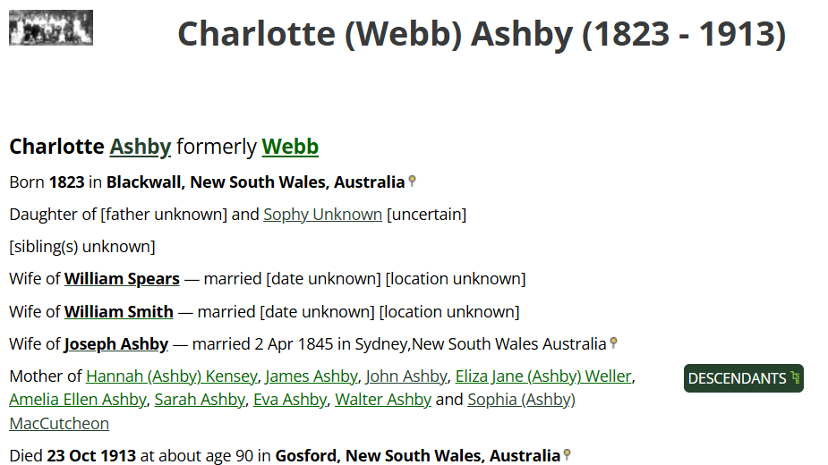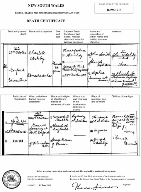 Charlotte Ashby’s death certificate lists her mother as being ‘Sophia’ rather than either Sophy or Sally. In spite of this, the leadership of the GuriNgai group have gone to extraordinary lengths to create the misperception that their claimed genealogy is uncontested, certain and factual, in spite of all evidence to the contrary.
