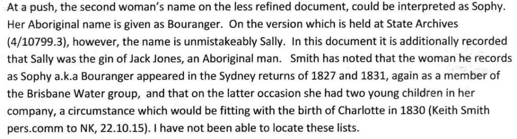 The 1835 blanket list clarifies that the person the GuriNgai claim is Sophy (claimed by GuriNgai as the mother of Charlotte), is actually Sally, the partner of Jack Jones – not as some GuriNgai claim, Sophy, the partner of John Smith, or as other GuriNgai claim, Sophy, the victim of James Webb.