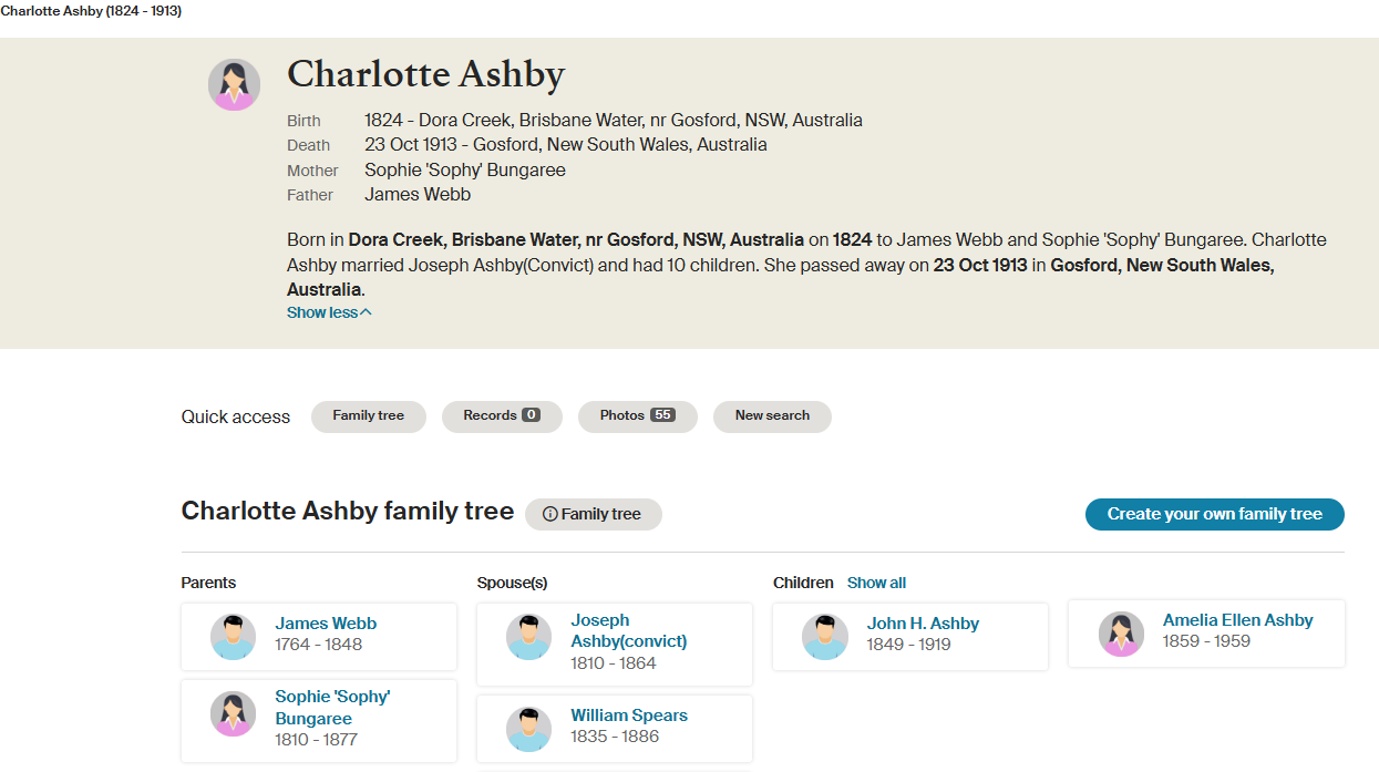The claims that Charlotte Ashby was the first recorded Aboriginal birth on the Central Coast are not supported by the available evidence. The record cited (NSW BDM BC 1830/2470 30A) is for a child named Charlotte, no surname listed, no parents listed, in 1830.