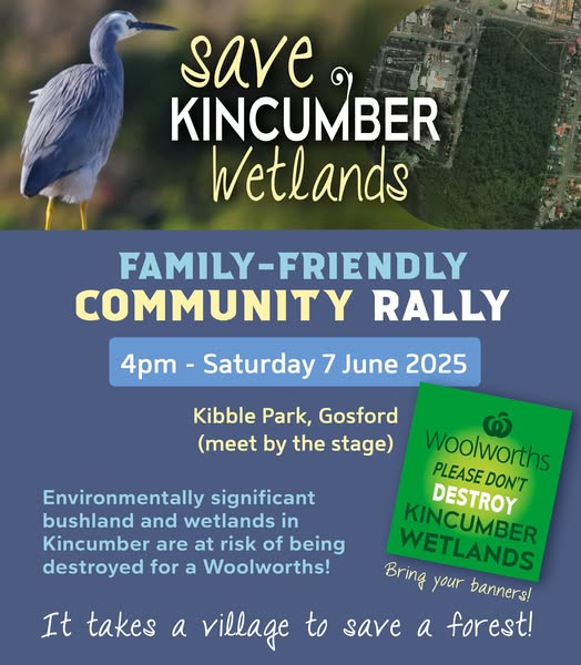 | Save Kincumber Wetlands | New 2025 campaign, started by local reserve activists and boosted by CEA members (Cassie Roese, John Byrnes). Supported by Coast4One network (speakers like Sue Chidgey, Colette Baron). Linked by theme (DLALC land slated for Woolworths) to Kariong fight. | Stop any lease/sale of wetland by DLALC to developers (Woolworths); protect endangered species habitat. Messaging appeals to DLALC to act as “custodian” not developer. |