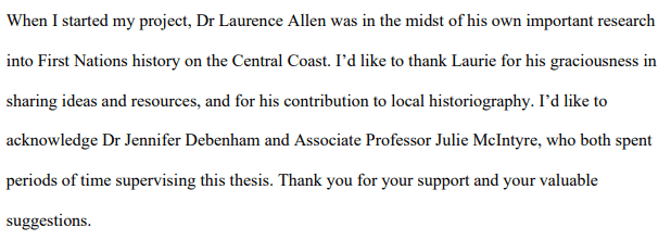 A decolonial response would require not only critical distancing from such figures but also institutional accountability: theses grounded in falsified genealogies should be retracted, and universities must consult with recognised Aboriginal Land Councils before validating identity-based historical claims. Stewart’s thesis, beginning with its Acknowledgments, exemplifies a failure to enact these responsibilities. The Acknowledgments thus function as a gateway for epistemic contamination, undermining the entire work’s scholarly integrity.