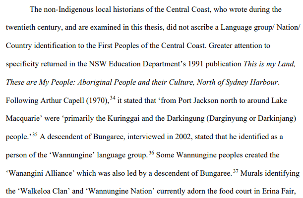 The most telling phrase in this concluding paragraph is the declaration that “contact history of the region can now be much more fully read, understood, explained and communicated.” This suggests that the thesis has produced epistemic closure: a final or settled account. Yet the very materials examined throughout the thesis demonstrate the opposite—that the Central Coast’s contact history is riddled with contradictions, settler myths, genealogical fabrications, and competing claims to cultural authority. Instead of reinforcing closure, a more honest conclusion would acknowledge the ongoing contestation of historical narrative and identity in this region, especially in the face of continued non-Aboriginal attempts to appropriate or simulate Indigenous identity under names such as “GuriNgai” or “Wannungine.”